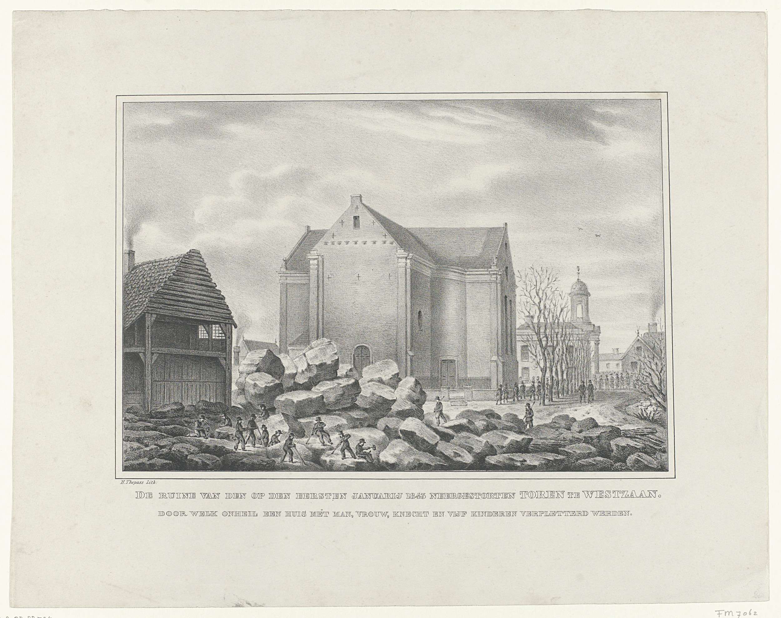 Gezicht op ruïne van de kerk te Westzaan en enkele belendende huizen, na de instorting van de kerktoren op 1 januari 1843. Centraal het overeind gebleven kerkgebouw en de stenen van de voormalige toren, in de verte het stadhuis. Zie ook de ontwerptekening voor deze prent.