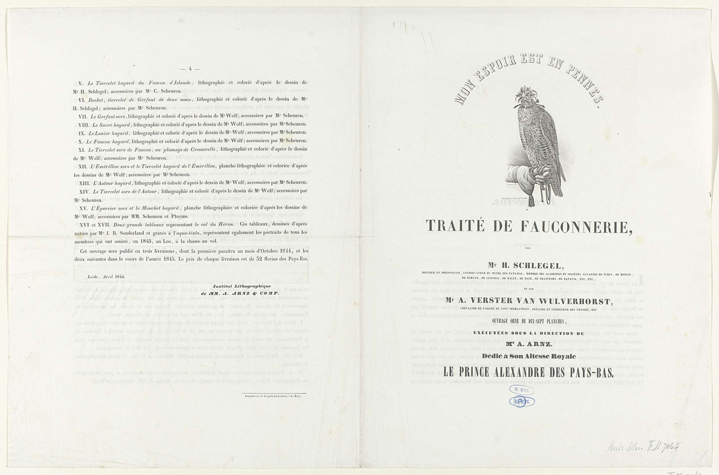 Prospectus voor een reeks van zeventien platen over de valkenjacht, het eerste deel te verschijnen in oktober 1844. Dubbelgevouwen blad bedrukt op alle zijden. Op de voorzijde de titel en de afbeelding van een valk zittend op een hand, op de andere bladzijden een overzicht van het project en een lijst van de XVII platen. ...