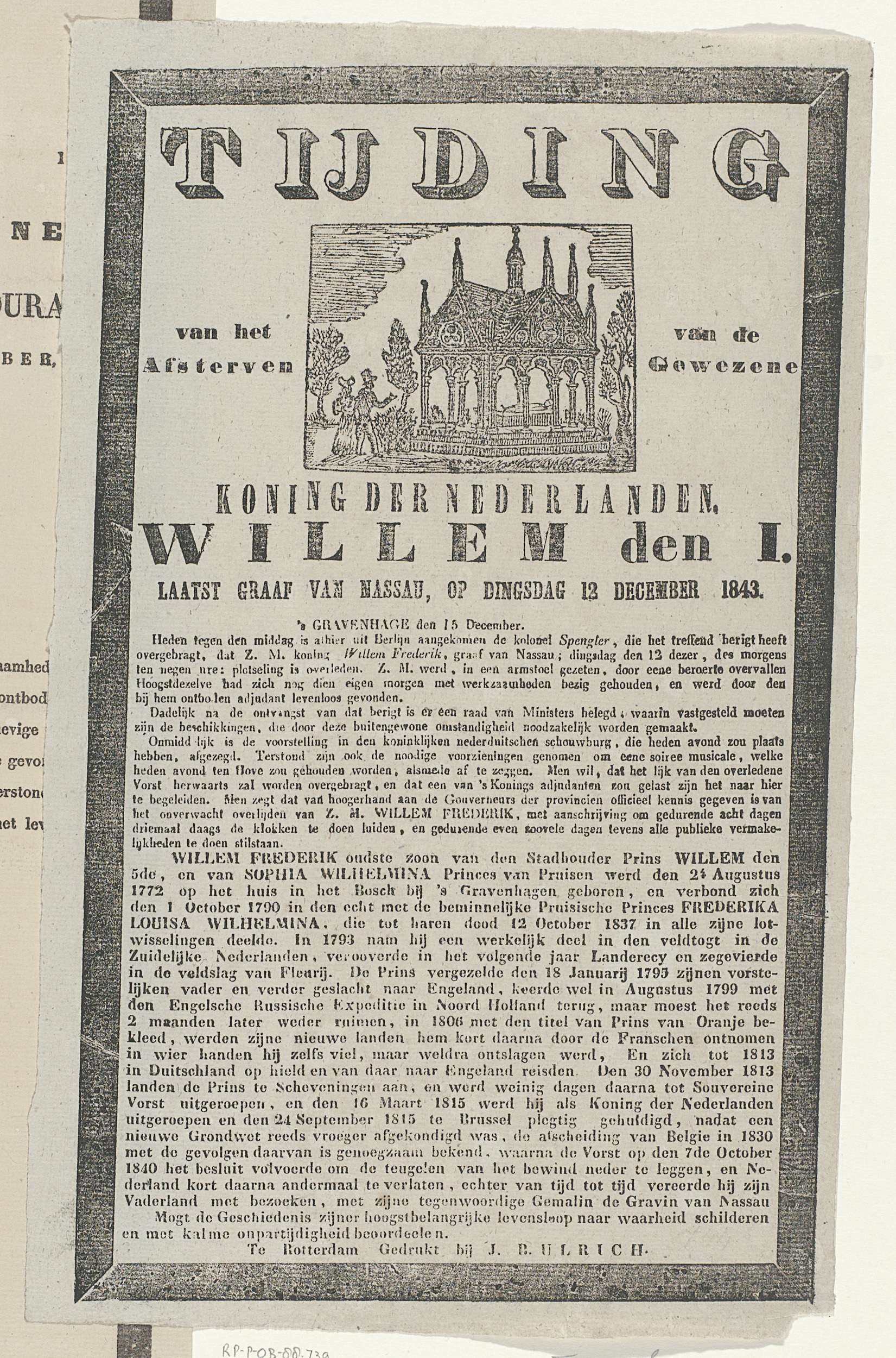 Tijding van het Afsterven van de Gewezene Koning der Nederlanden, Willem den I. Laatst Graaf van Nassau, op dinsdag 12 december 1843