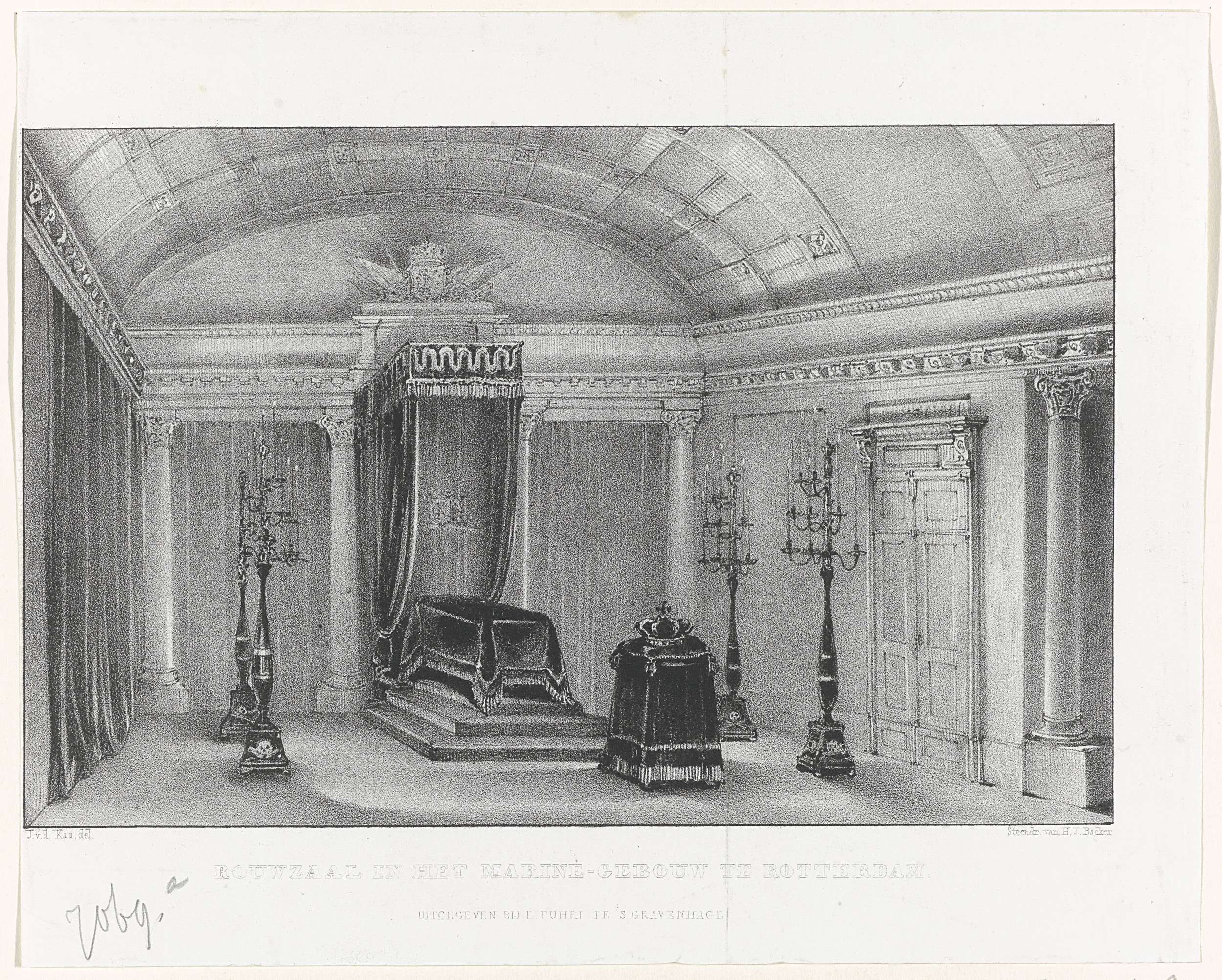 Rouwzaal in de Marinewerf te Rotterdam, met de lijkkist en regalia van de voormalige koning Willem I, overleden op 12 december 1843.