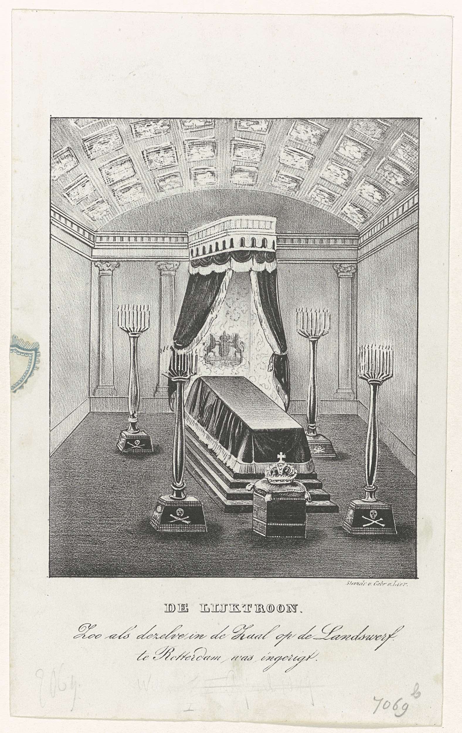 Rouwzaal met de lijkkist en regalia van koning Willem I, 1843
