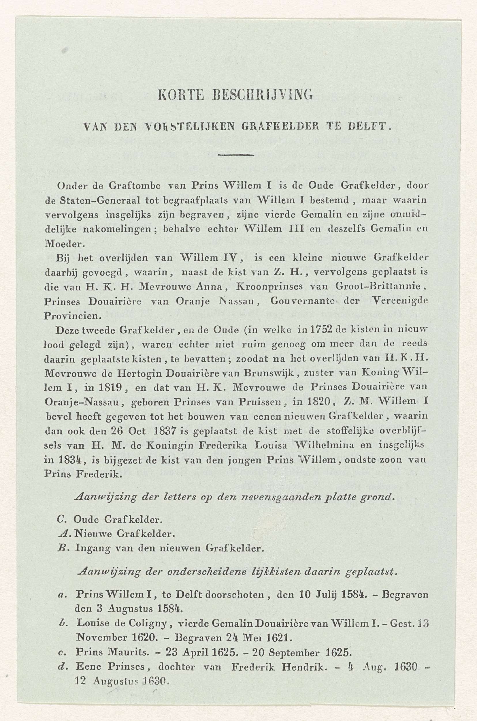 Legenda behorend bij de plattegrond en doorsnede van de grafkelder van Oranje-Nassau in de Nieuwe Kerk te Delft. Behoort bij de prenten van de begrafenis van de voormalige koning Willem I te Delft op 2 januari 1844. Blad bedrukt op beide zijden, pagina 177-118 uit het boek.