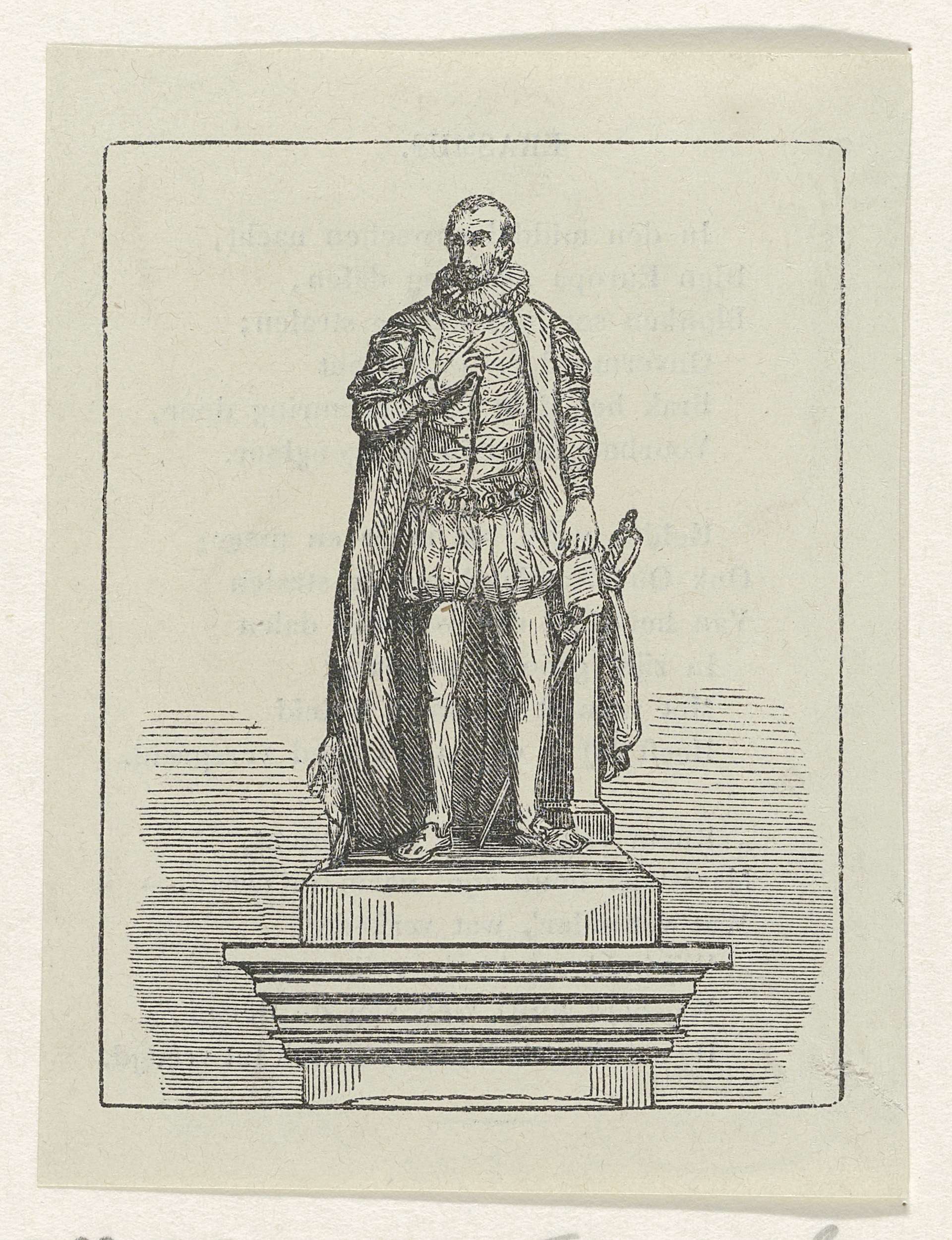 Standbeeld van Willem van Oranje van Louis Royer op het Plein in Den Haag, ca. 1850. Op de achterzijde bedrukt met een vers over Erasmus.