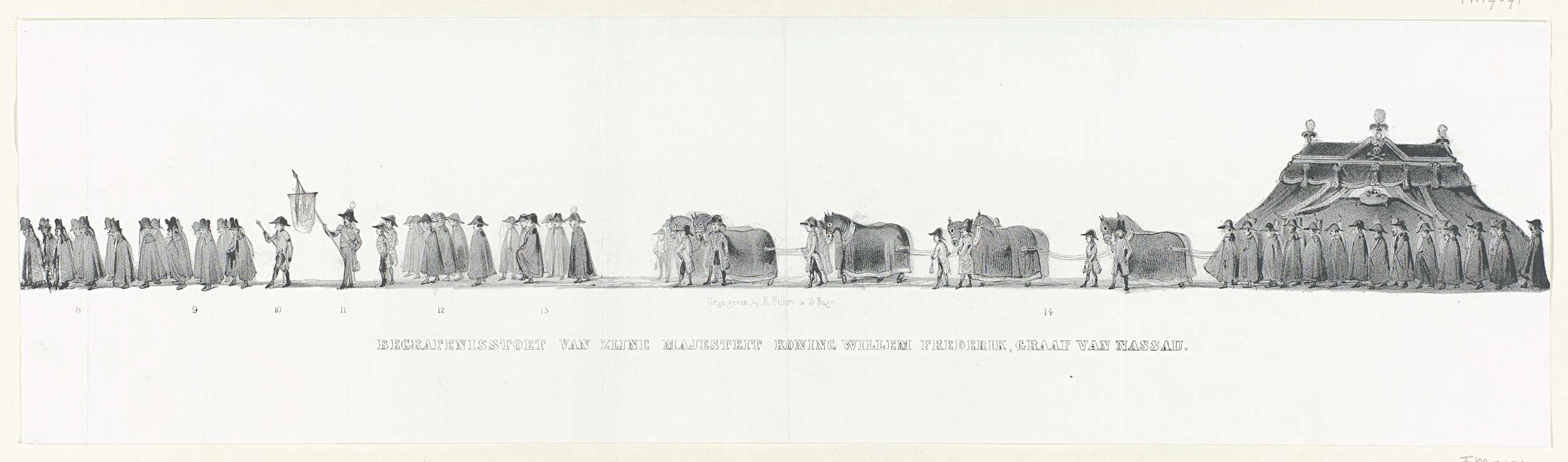 Begrafenisstoet van de voormalige koning Willem I te Delft op 2 januari 1844. De geheel stoet afgebeeld in drie opeenvolgende platen, tweede plaat met de nummers 8-14.