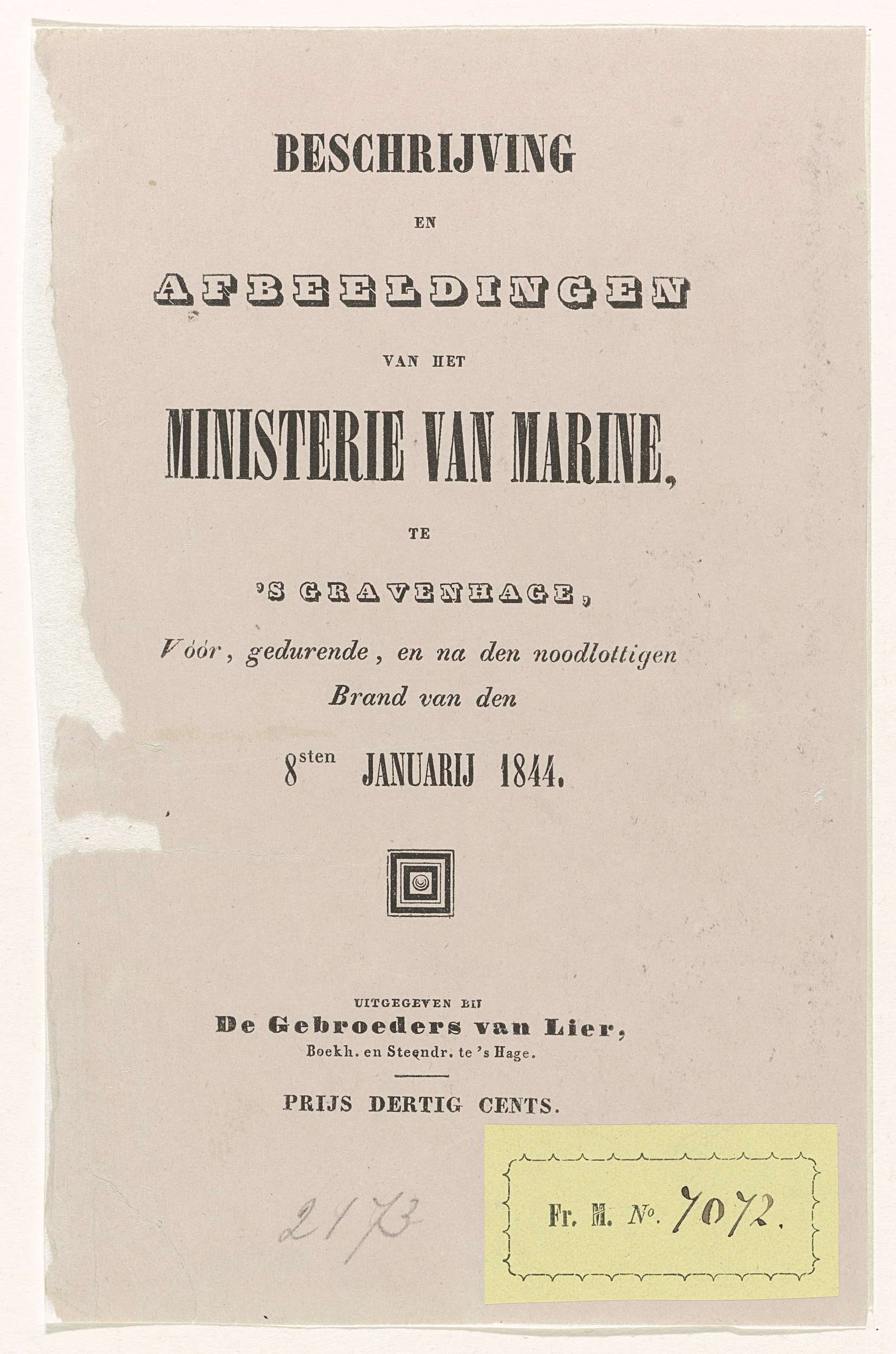 Titelblad van het boekje getiteld: Beschrijving en Afbeeldingen van het Ministerie van Marine, te 's Gravenhage, Vóór, gedurende, en na den noodlottigen Brand van den 8sten Januarij 1844. Zie ook de twee andere bijbehorende platen en een fragment van de omslag.
