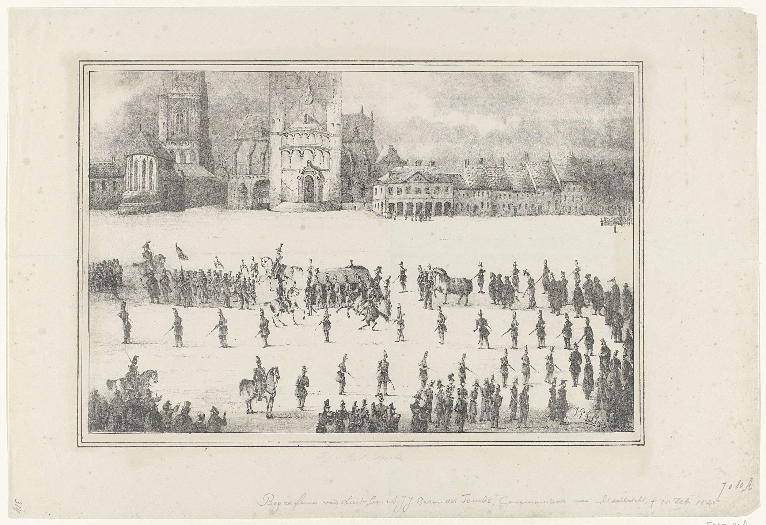 Begrafenis van luitenant-generaal A.J.J. Baron des Tombe, commandeur van Maastricht, overleden op 18 februari 1845. De begrafenisstoet trekt over het Vrijthof langs de Sint-Servaasbasiliek.