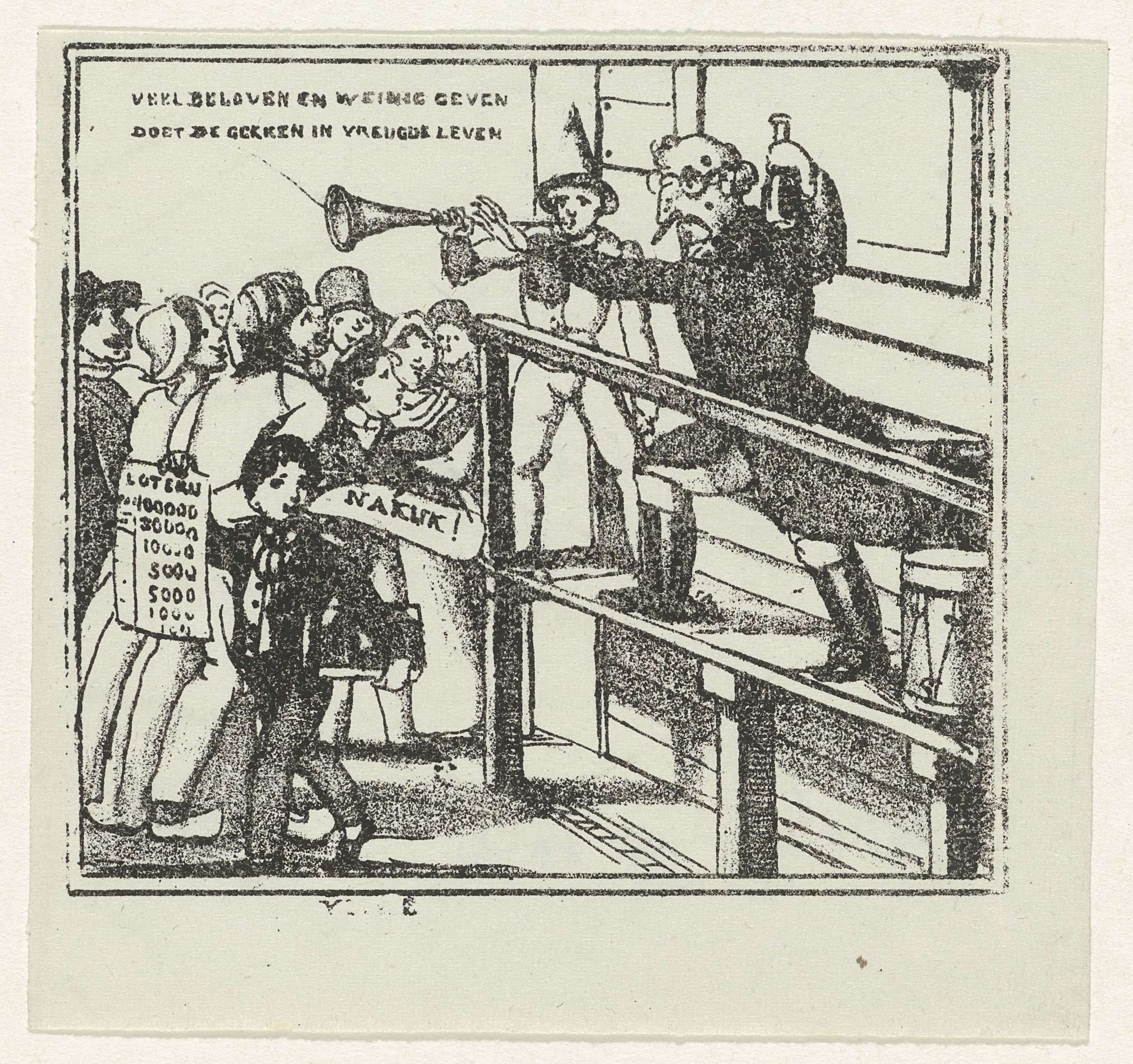 Een kwakzalver en een hansworst op een podium proberen het volk een middeltje in een fles aan te smeren. Op de voorgrond loopt een jongen loten voor de loterij te verkopen. Behorend bij een serie van zes humoristische plaatjes, spotprenten op de Haagse politiek, belastingen en andere maatschappelijke toestanden, ca. 1845.