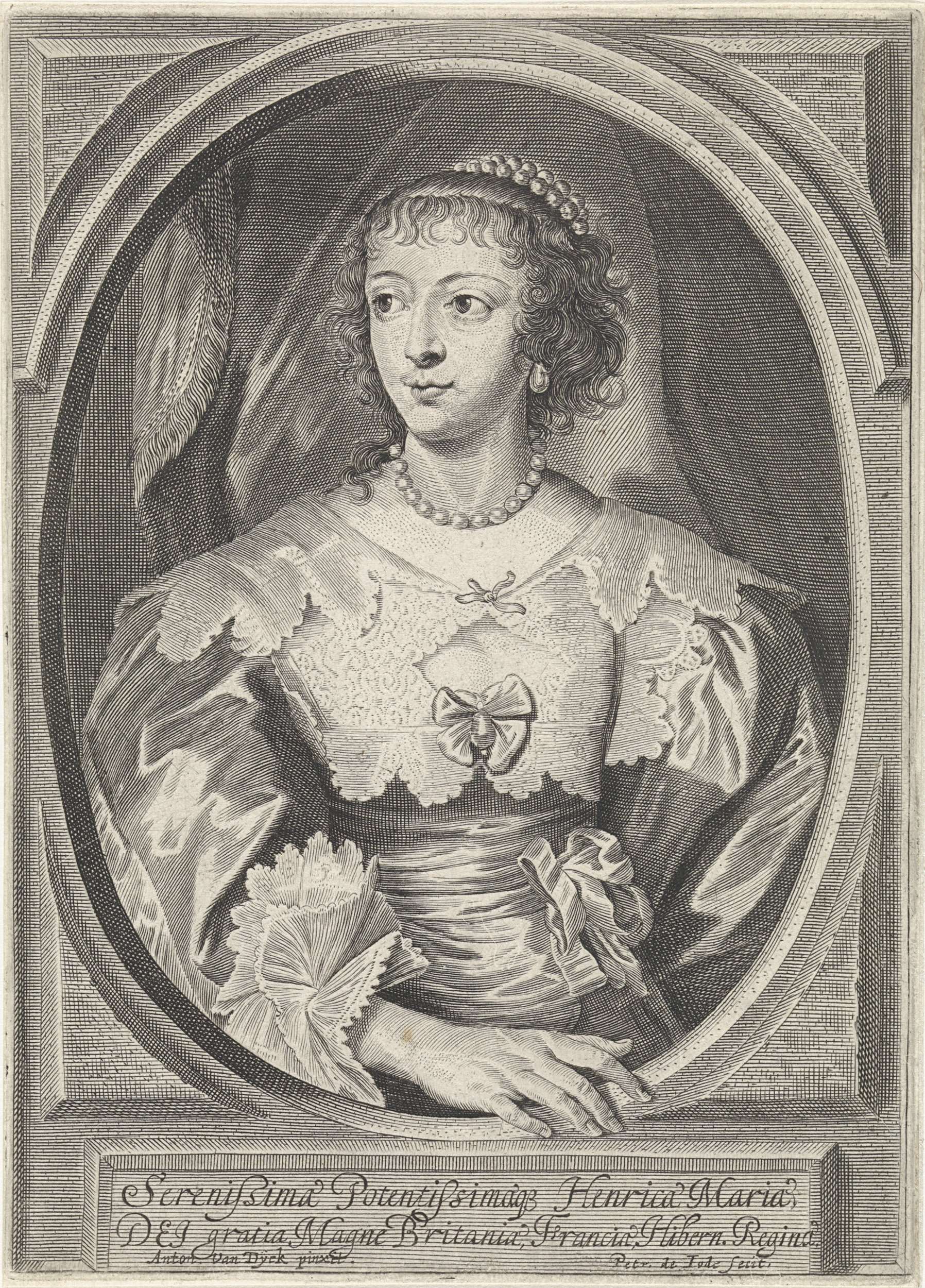 Busteportret van Henriette Maria. Het portret is gevat in een ovale omlijsting, haar rechterhand rust op de rand. In het kader onder de omlijsting een tweeregelig onderschrift in het Latijn.