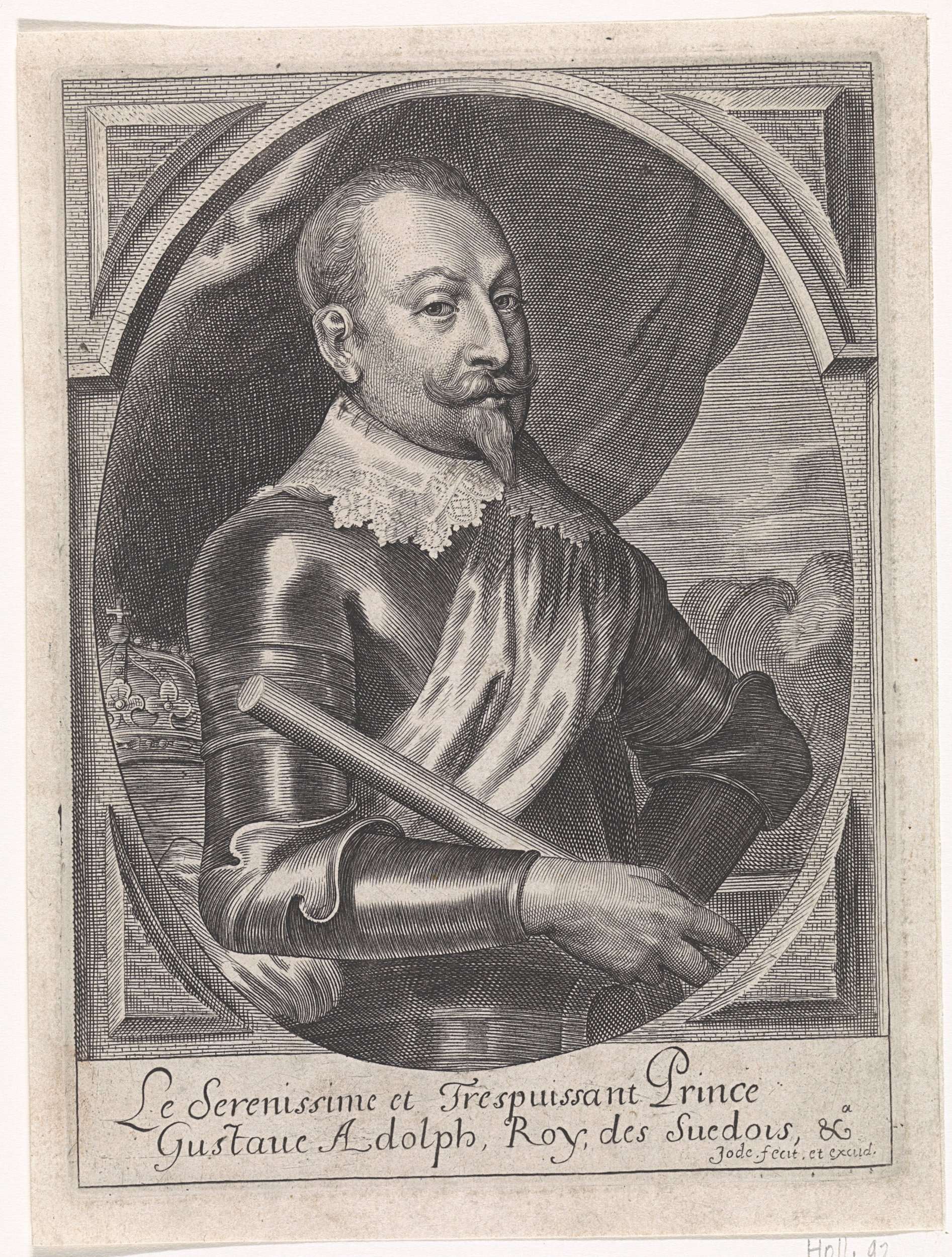Portret van Gustaaf II Adolf, ten halven lijve. In zijn rechterhand houdt hij een commandostaf. Op de achtergrond een kroon. Het portret is gevat in een ovale omlijsting met vierkant randwerk. In de marge een tweeregelig onderschrift in het Frans.