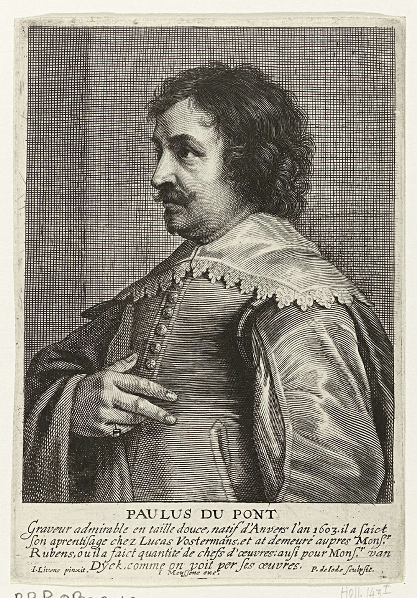 Portret van Paulus Pontius, ten halven lijve. Hij houdt zijn rechterhand tegen zijn lichaam. In de marge de naam van de geportretteerde en een vierregelig onderschrift in het Frans.