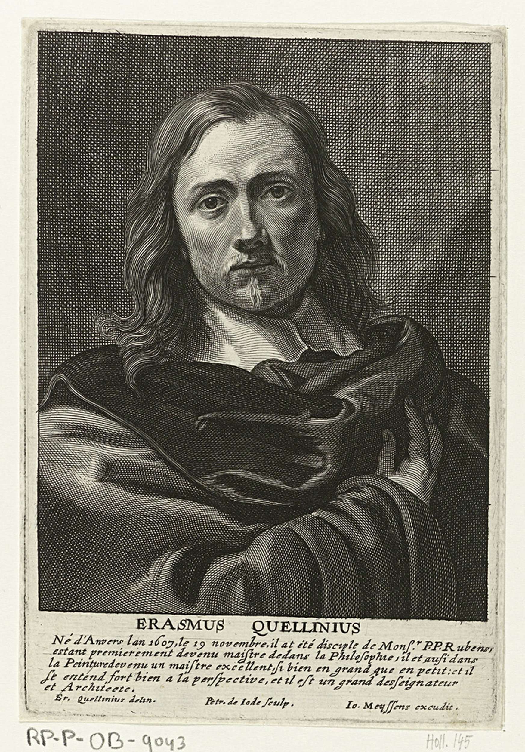 Busteportret van Erasmus Quellinus (II). Hij houdt zijn rechterhand tegen zijn borst. In de marge de naam van de geportretteerde en een vijfregelig onderschrift in het Frans.