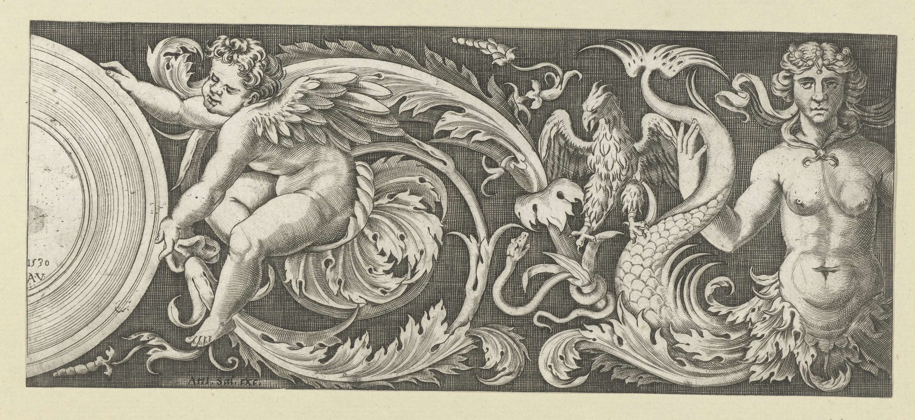 Fries met bladranken die ontspruiten aan een nereïde en eindigen in een bloem waarop een putto zit. De putto houdt met beide handen een leeg medaillon vast dat voor de helft zichtbaar is.