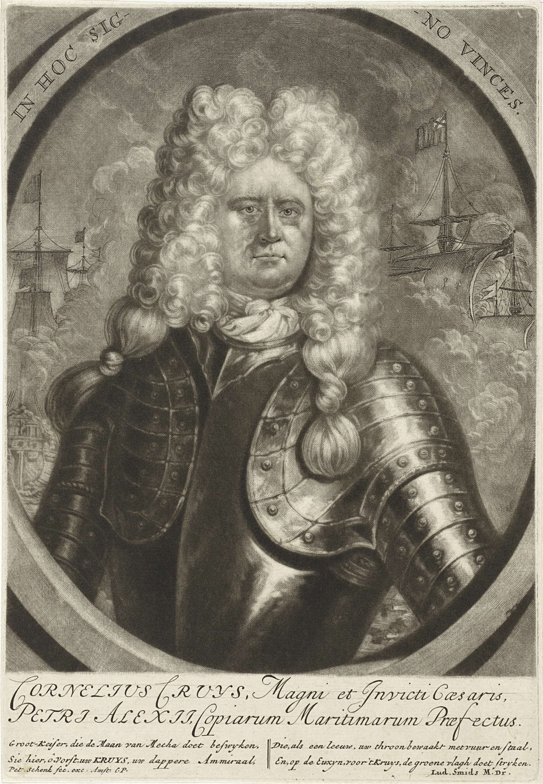 Cornelis Cruys, admiraal onder Tsaar Peter de Grote. Op de achtergrond enkele schepen.