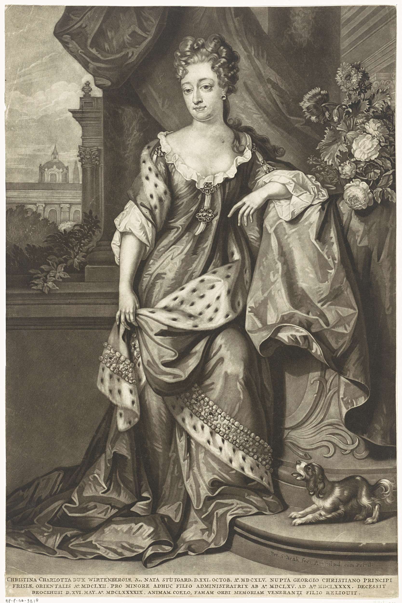 Christina Charlotte, hertogin van Württemberg staat naast een boeket van bloemen. Naast haar een blaffend hondje en op de achtergrond enkele gebouwen.