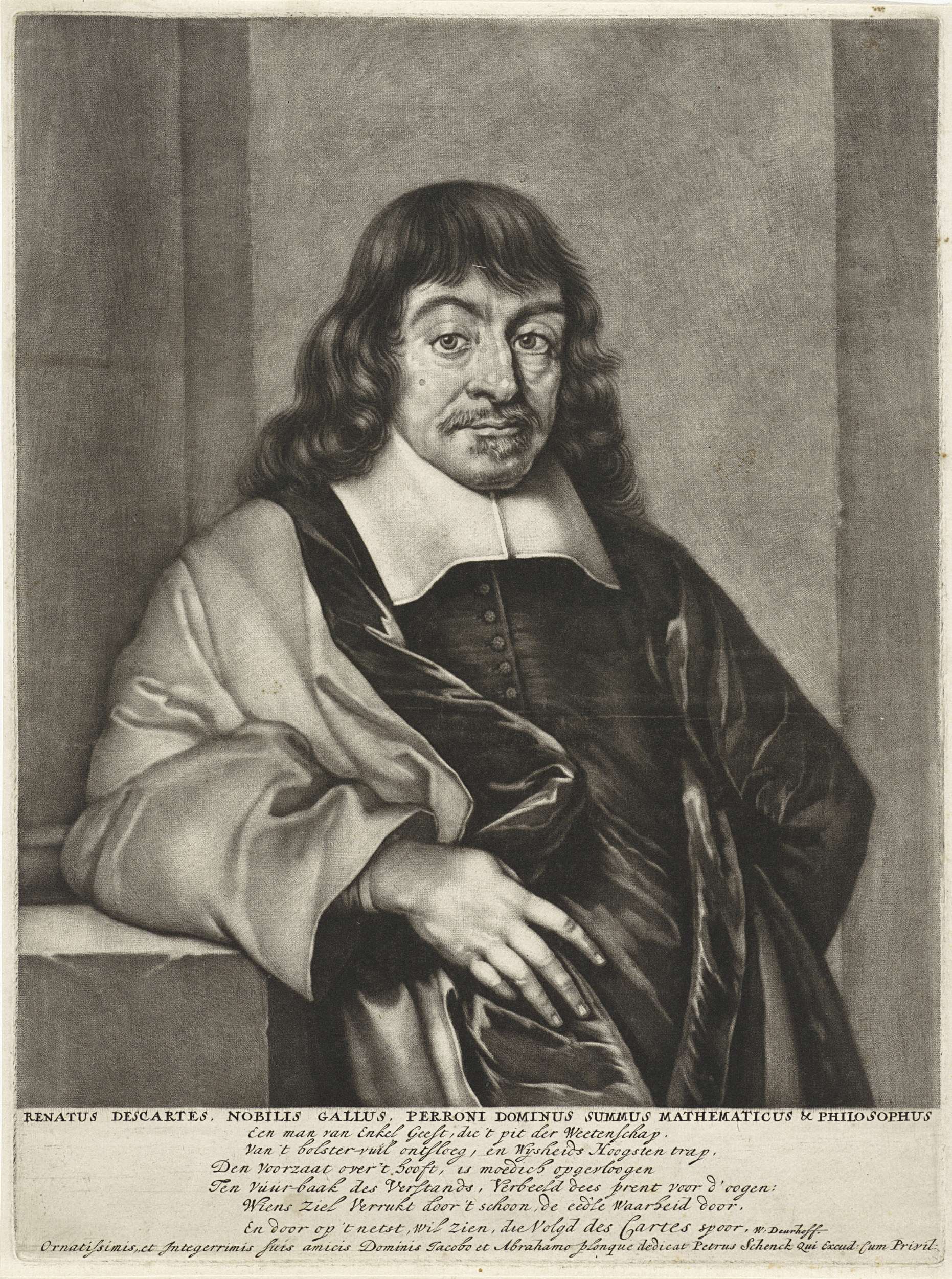 René Descartes, Frans filosoof en wiskundige. Hij leunt met zijn arm op een piëdestal.