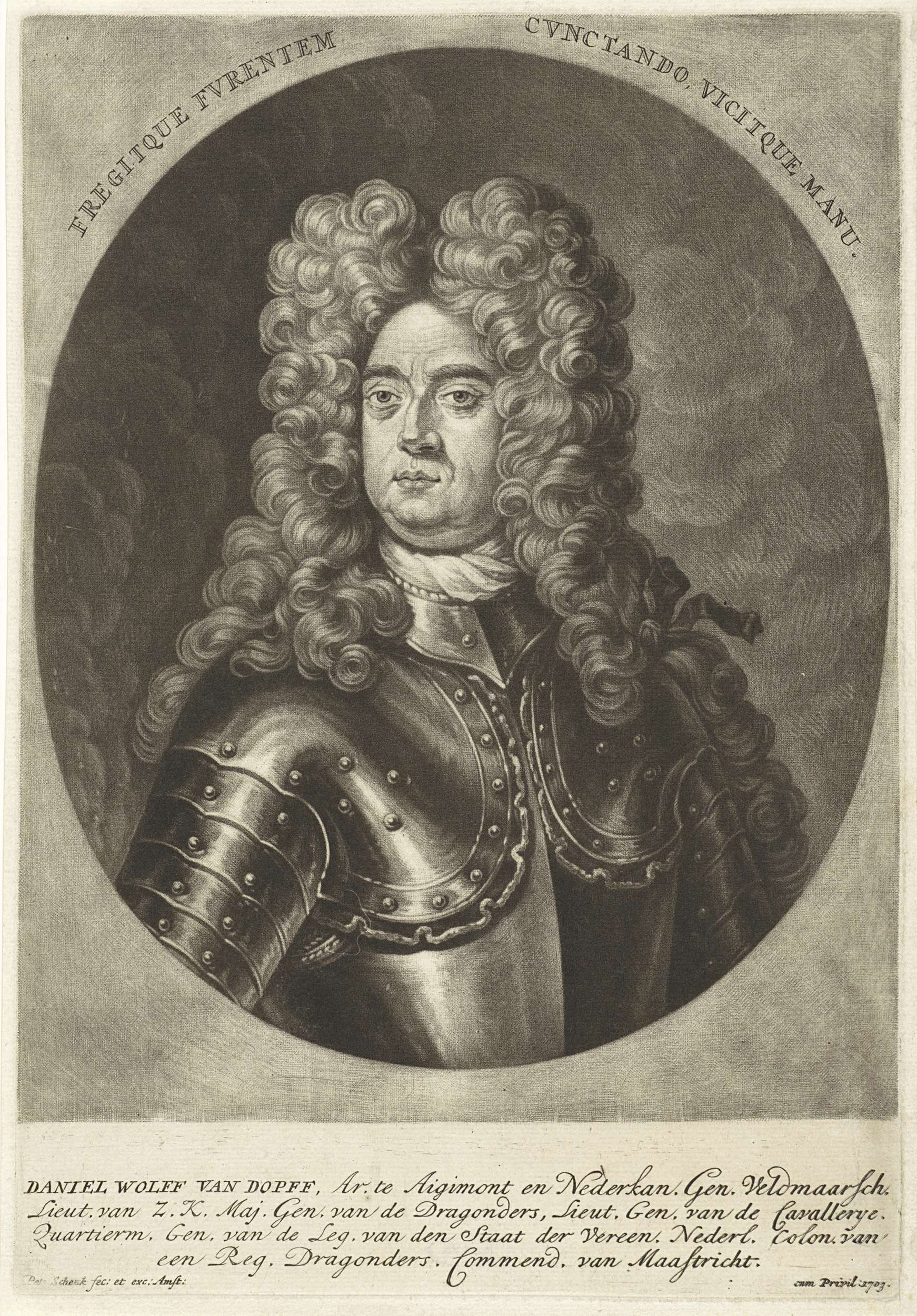 Luitenant-Generaal en Veldmaarschalk Daniël Wolff van Dopff in een harnas. Hij draagt een lange krulpruik. Op de achtergrond rookpluimen.