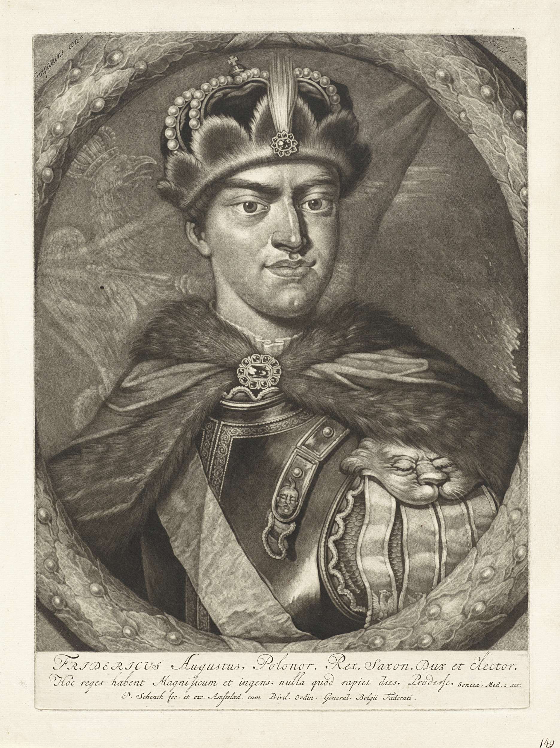 Augustus II, keurvorst van Saksen en koning van Polen, bijgenaamd 'De Sterke'. In Saksen werd hij Frederik August I genoemd. Hij draagt de koningskroon.