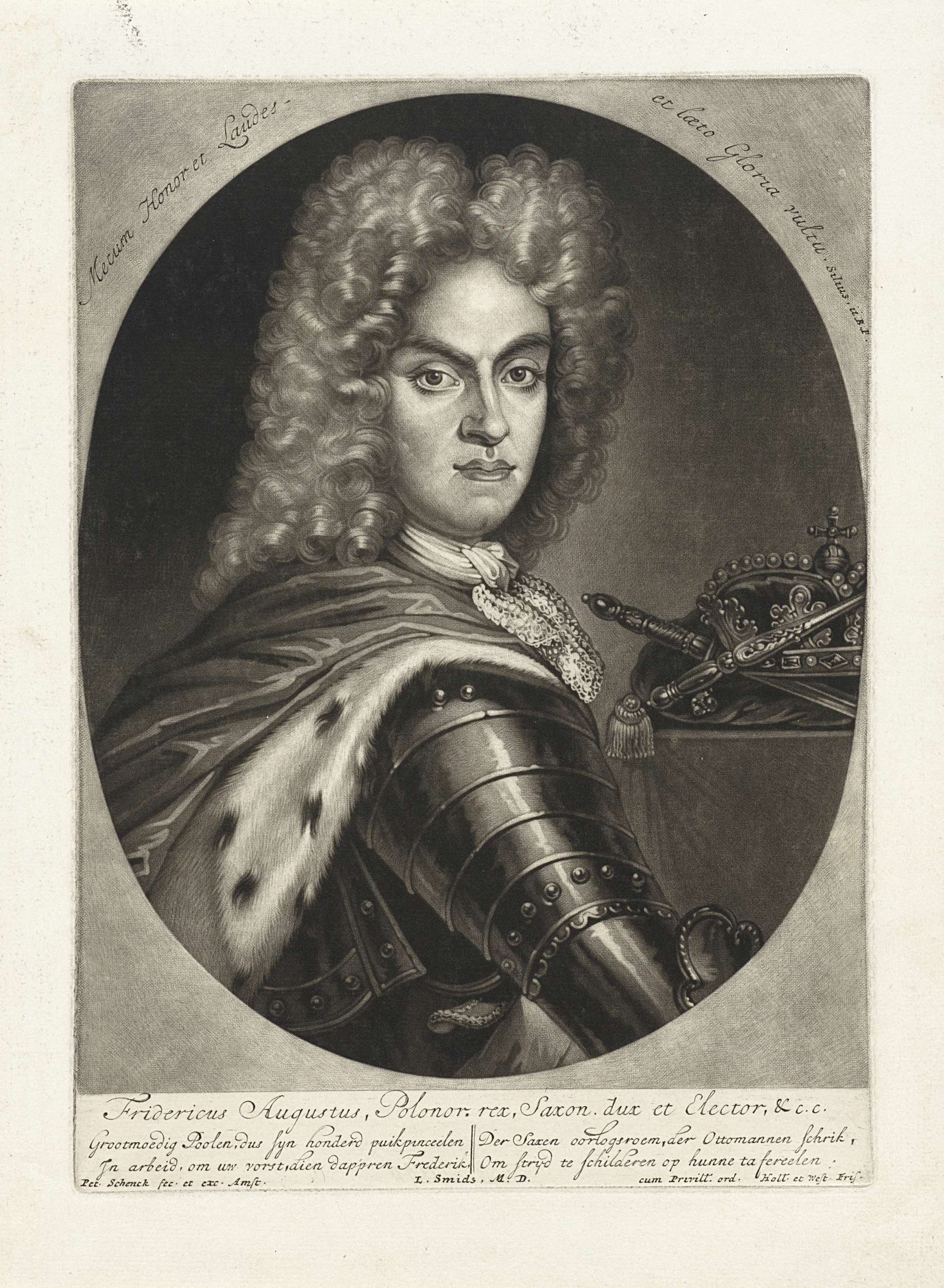 Augustus II, keurvorst van Saksen en koning van Polen, bijgenaamd 'De Sterke'. In Saksen werd hij Frederik August I genoemd. Hij draagt een harnas, naast hem de koningskroon.