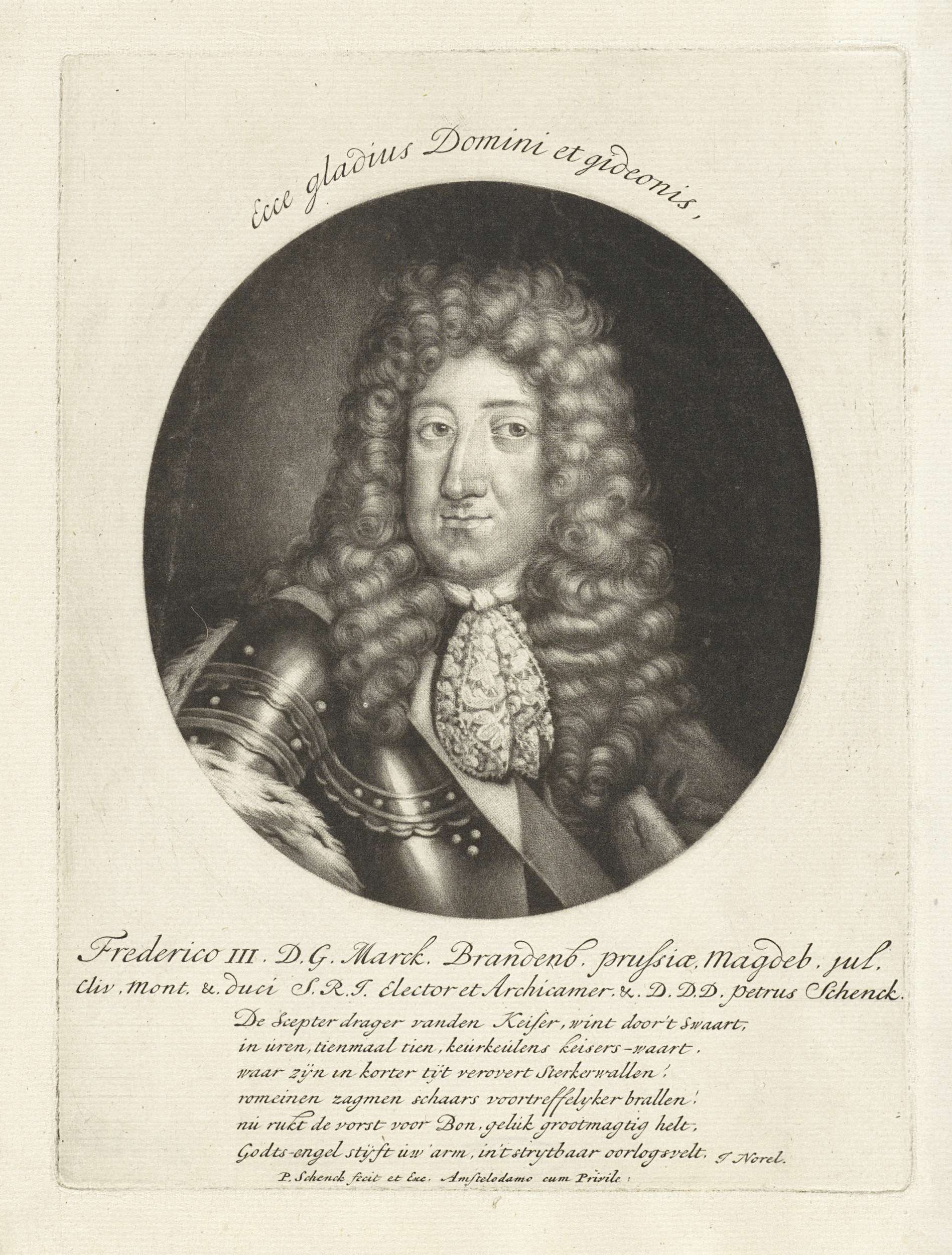 Frederik I, koning in Pruisen en als Frederik III, keurvorst van Brandenburg. Hij was van 1688 tot 1701 keurvorst van Brandenburg en tot zijn dood Frederik I koning van Pruisen. Hij draagt een harnas en een pruik.