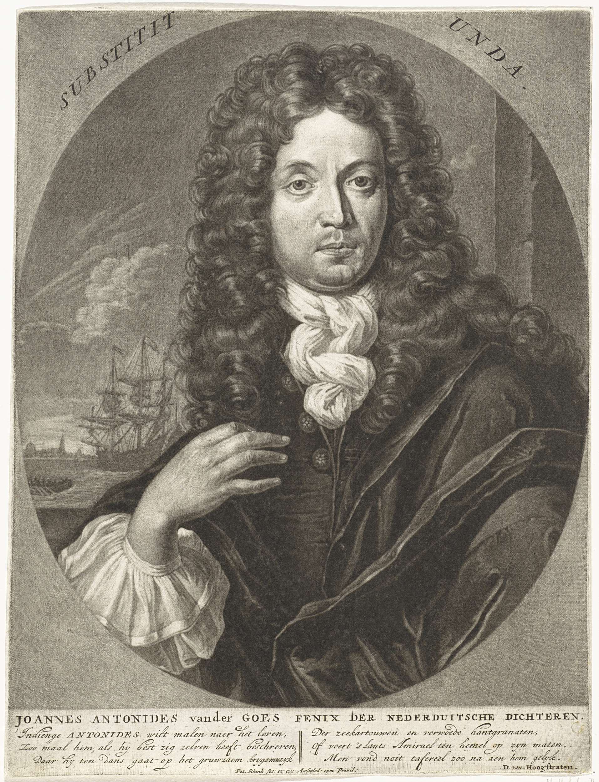 Jan Antonides van der Goes, Amsterdamse dichter, toneelvertaler en toneelschrijver. Hij draagt een pruik. Op de achtergrond een schip.