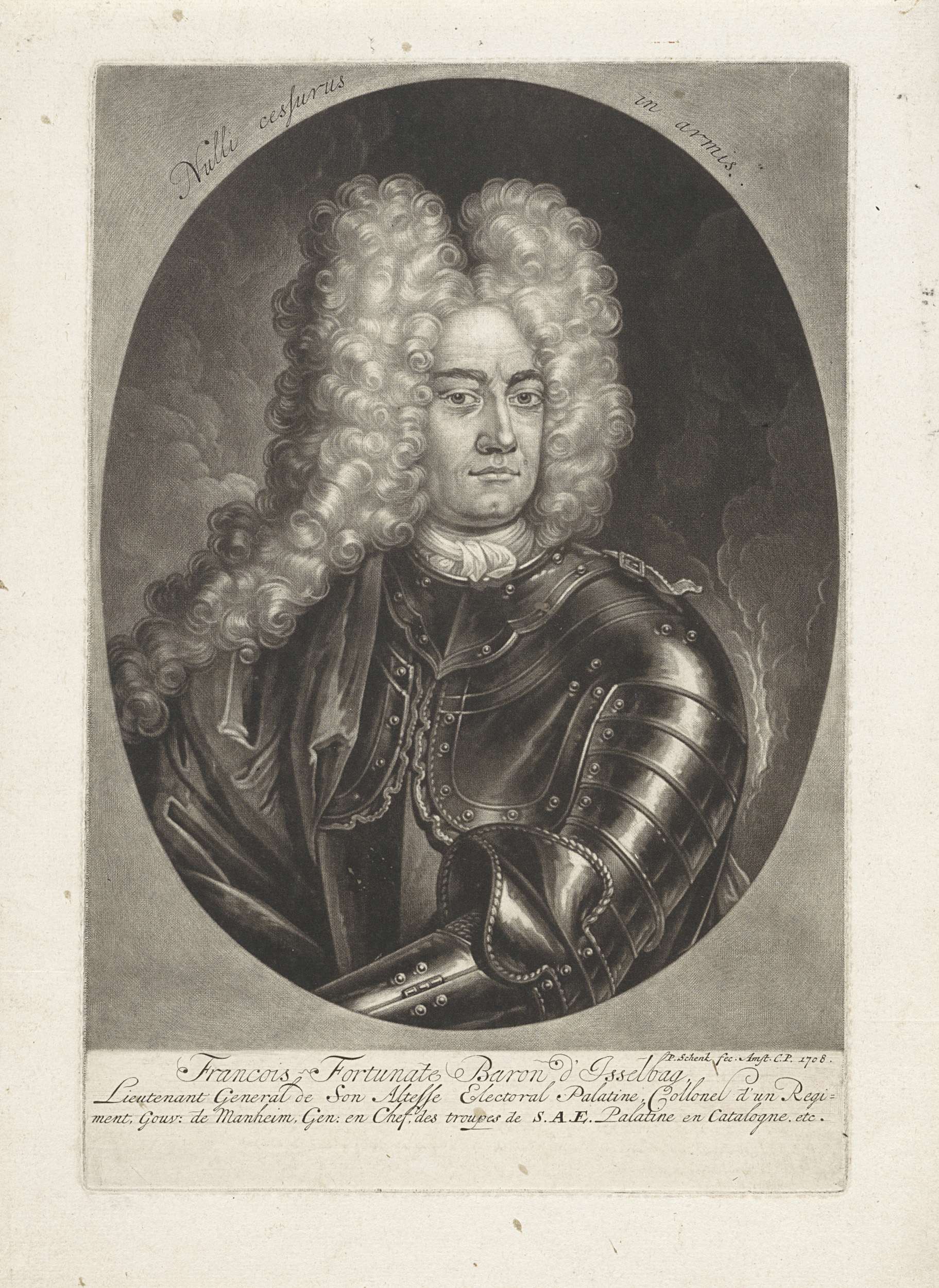 François Fortunate, baron van Isselbach, in een harnas met een lange krulpruik. Op de achtergrond rookwolken.