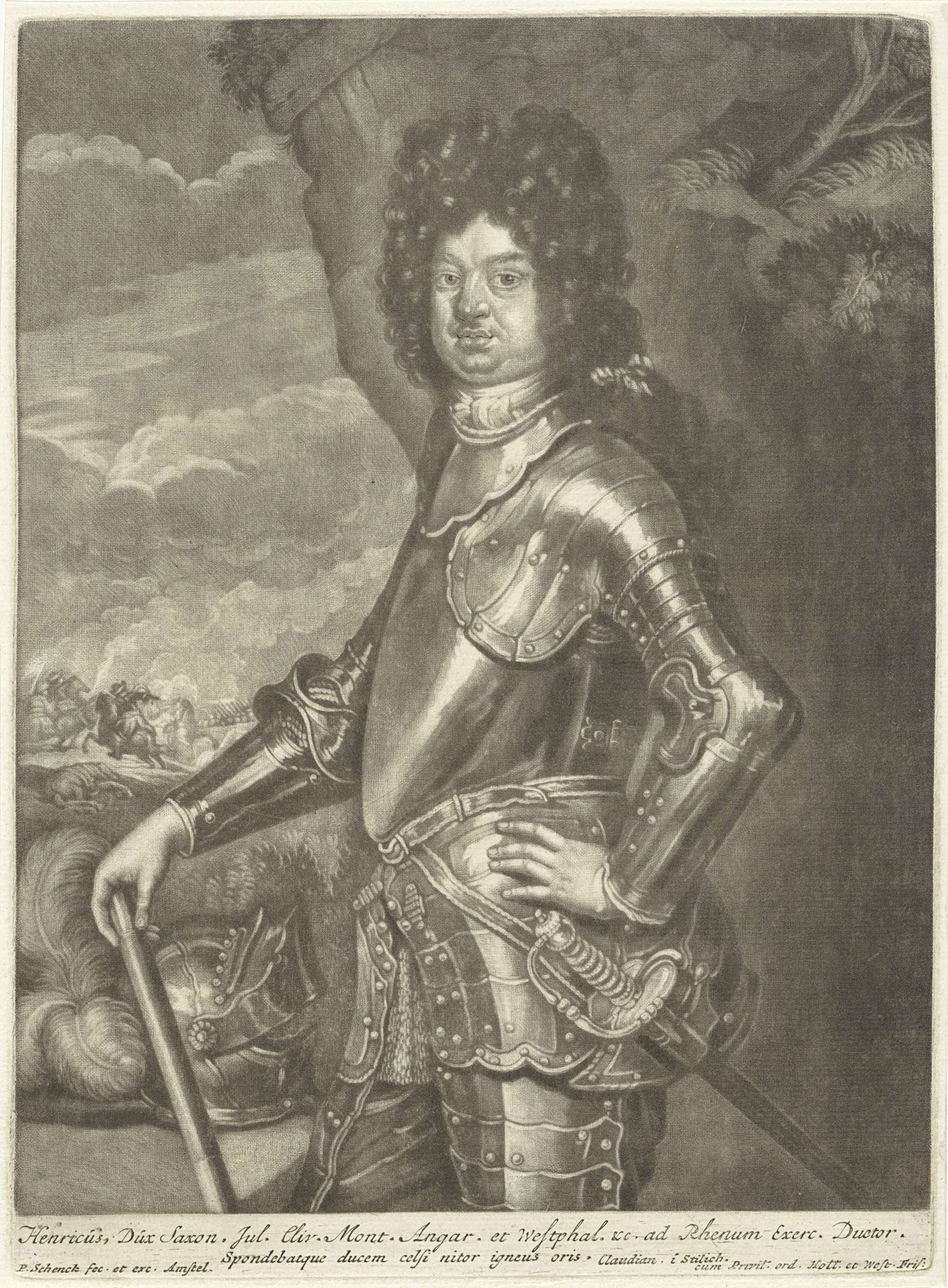 Heinrich hertog van Saksen-Merseburg draagt een harnas en een lange krulpruik. Op de achtergrond een slagveld.