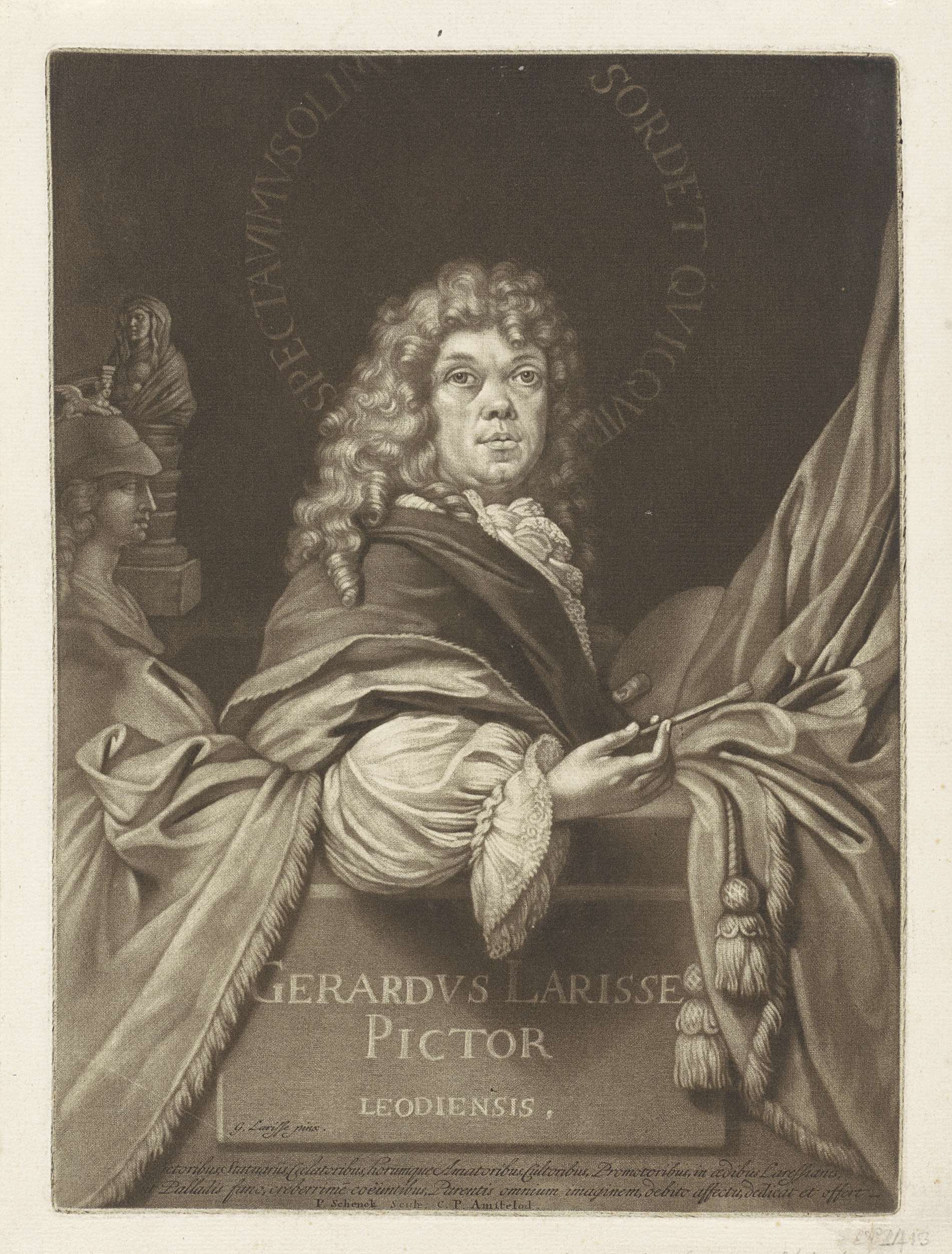 De Luikse prentmaker en schilder Gerard de Lairesse met in de hand een penseel en een palet. Op de achtergrond twee sculpturen.