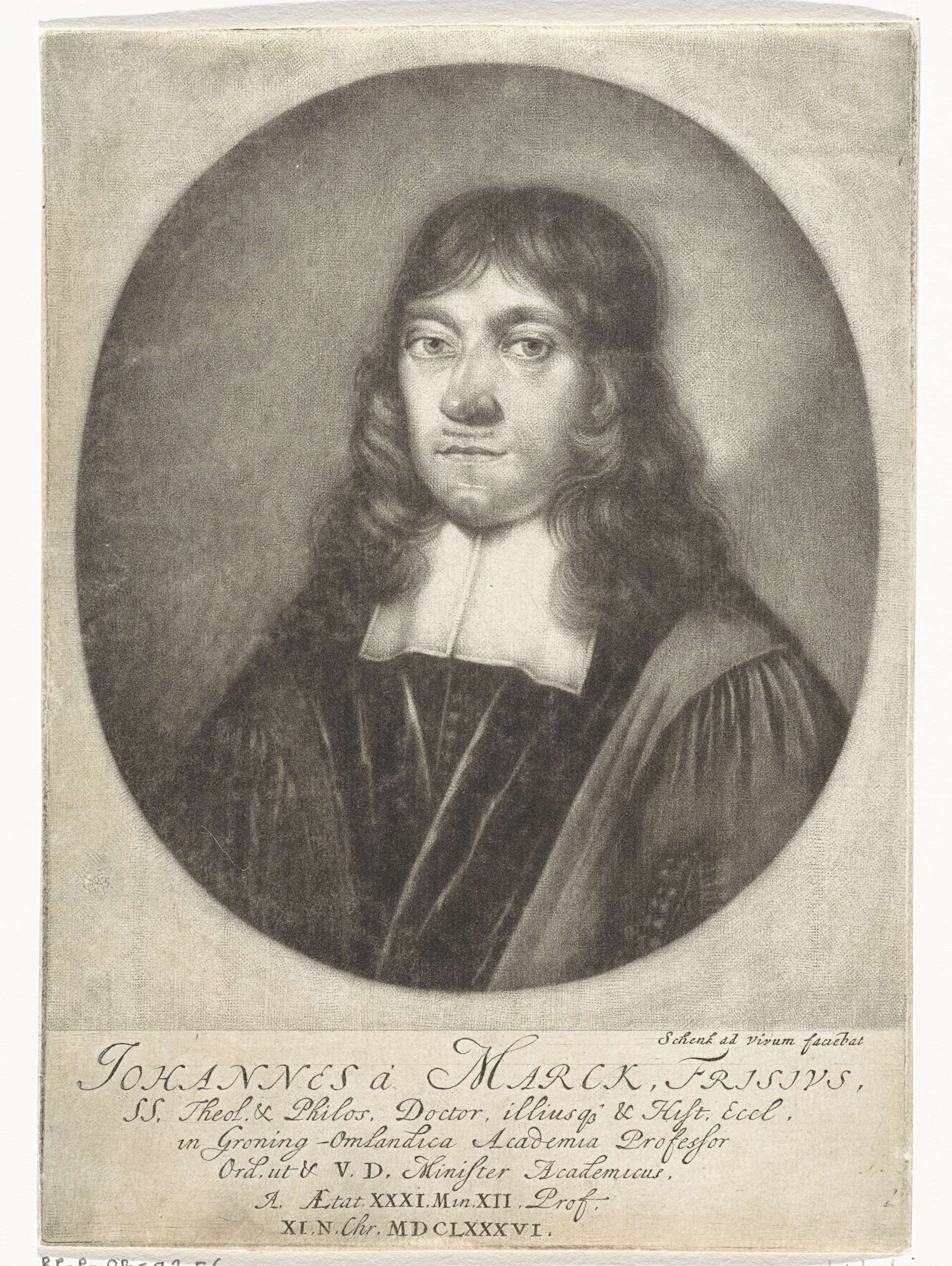 Predikant en hoogleraar in de theologie Johannes à Marck gekleed in toga met witte bef.
