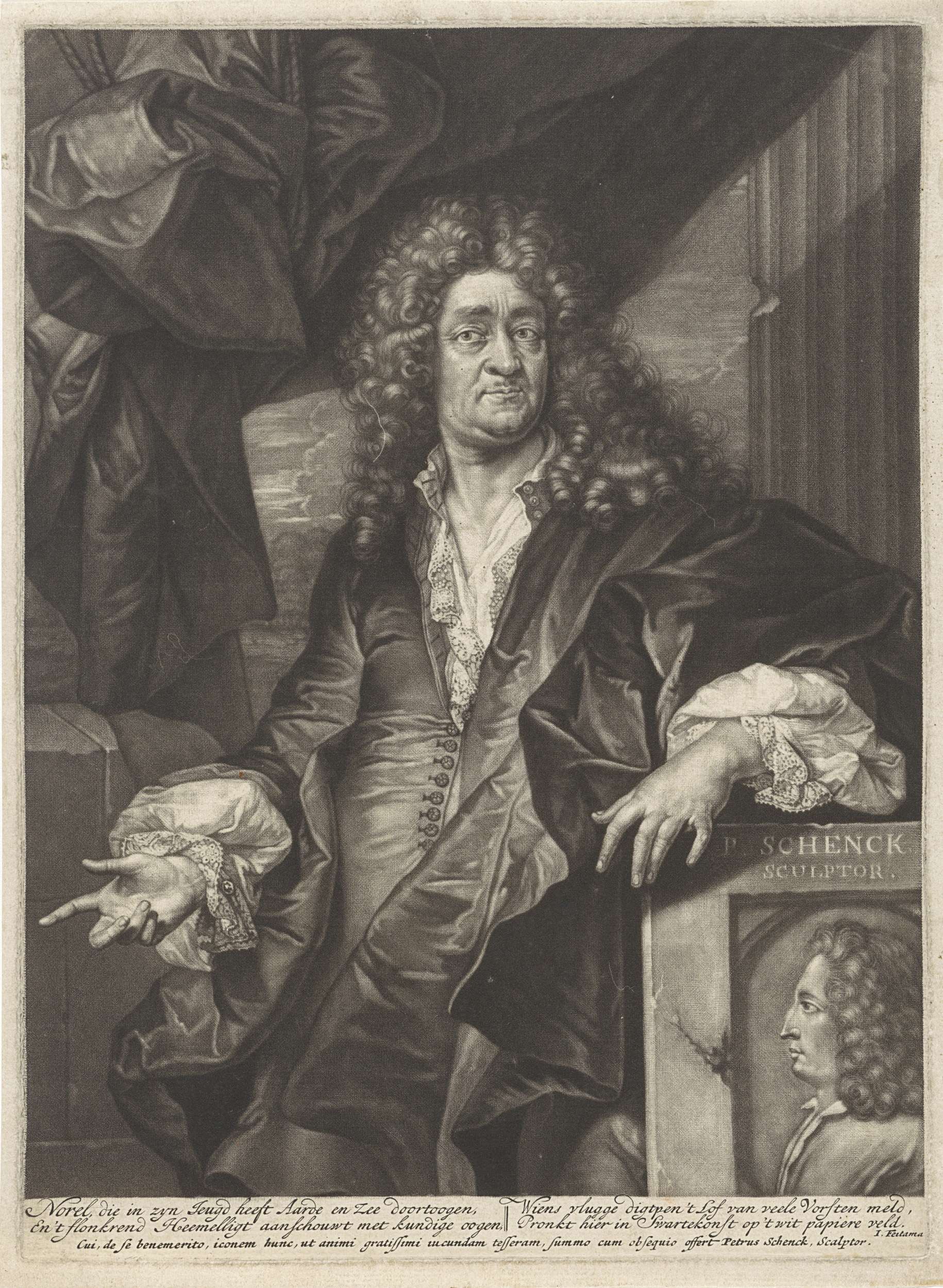 De dichter Jan Norel staat naast een plaquette waarop een portret in profiel. In de marge een lofdicht op de reislustigheid en de dichtkunst van de geportretteerde.