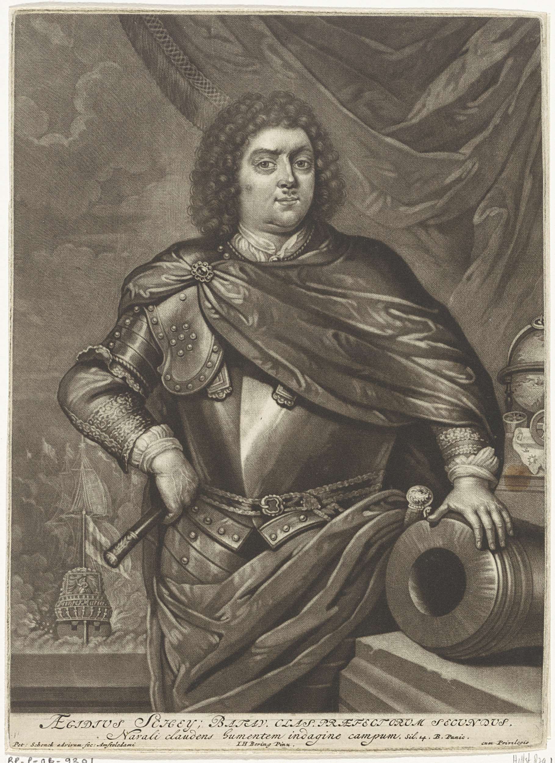 De admiraal Pieter Gilles Schey in harnas, met zijn hand op een kanon. Op de achtergrond een zeeslag.