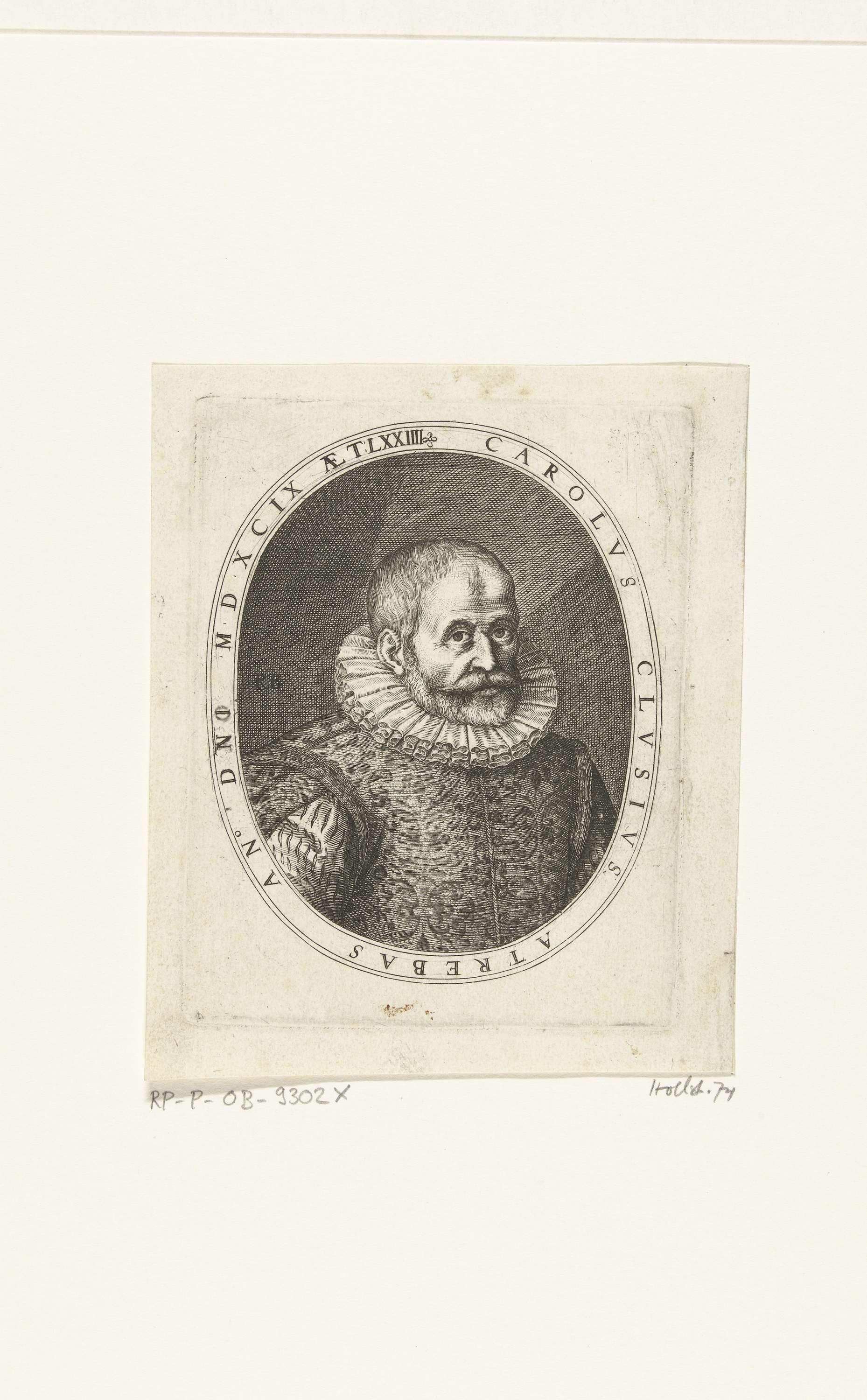Portret van de geleerde Carolus Clusius op 74-jarige leeftijd, buste naar rechts in ovaal. Met tekst in randschrift.
