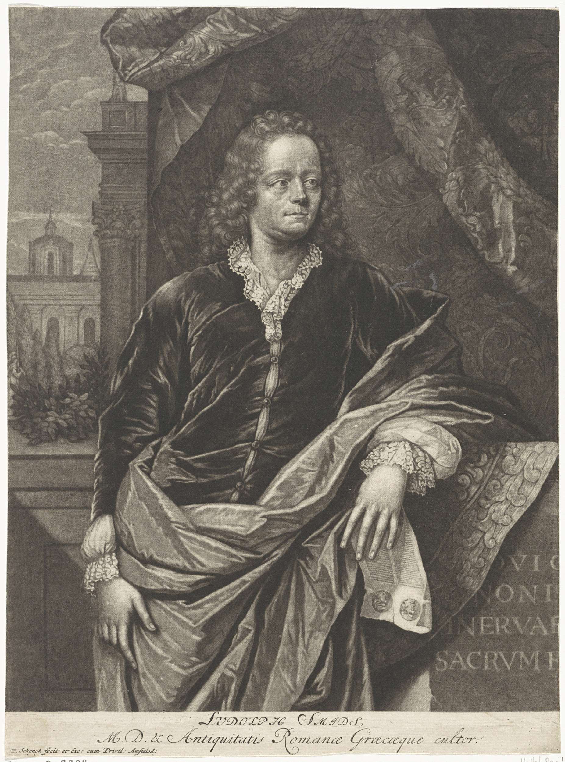 De dichter, oudheidkundige en arts Ludolph Smids met in zijn hand een brief waarop twee medaillons waarin klassieke bustes. Achter hem een draperie en een gebouw.