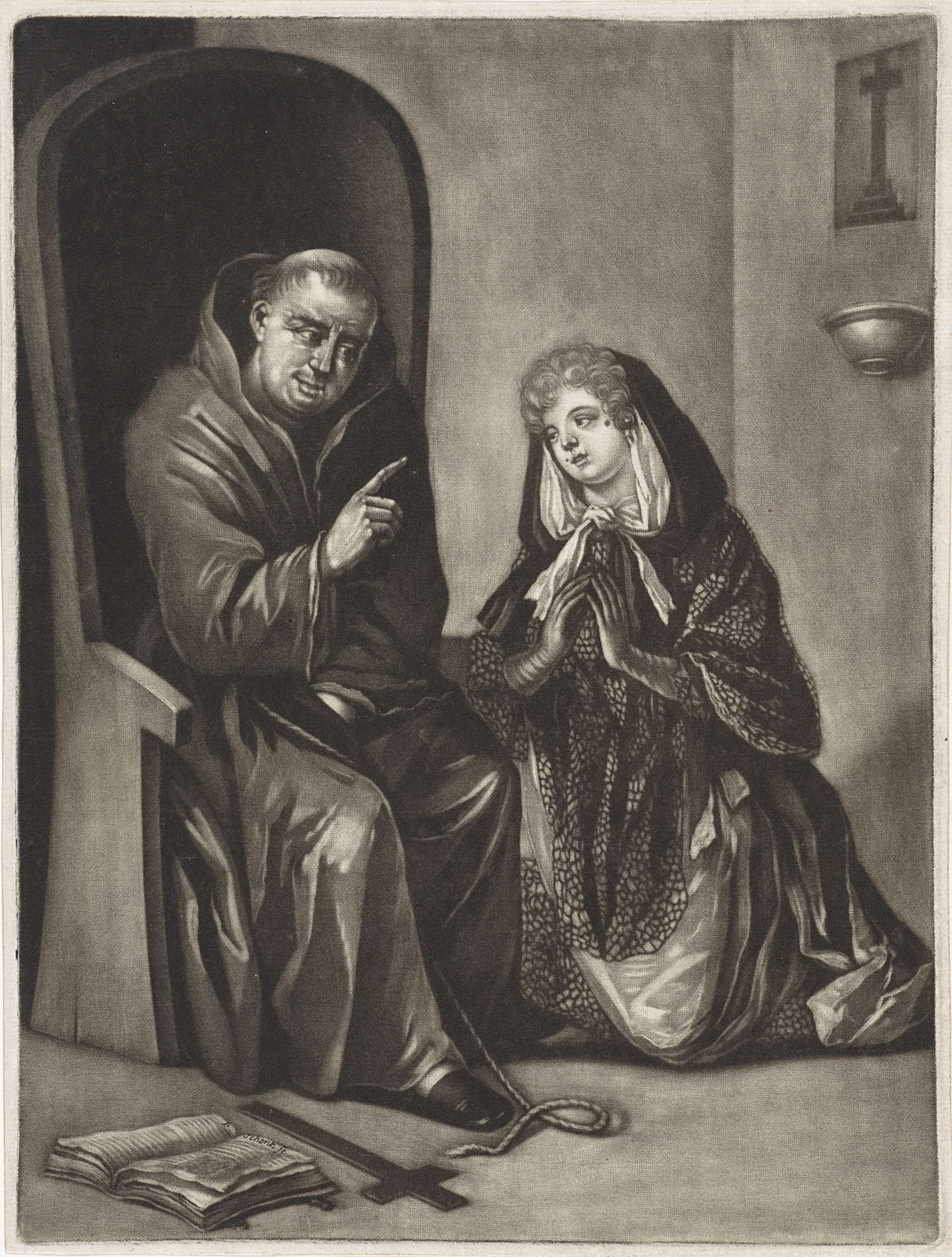 Een monnik neemt de biecht af bij een vrouw. Op de grond liggen een bijbel en een kruis.