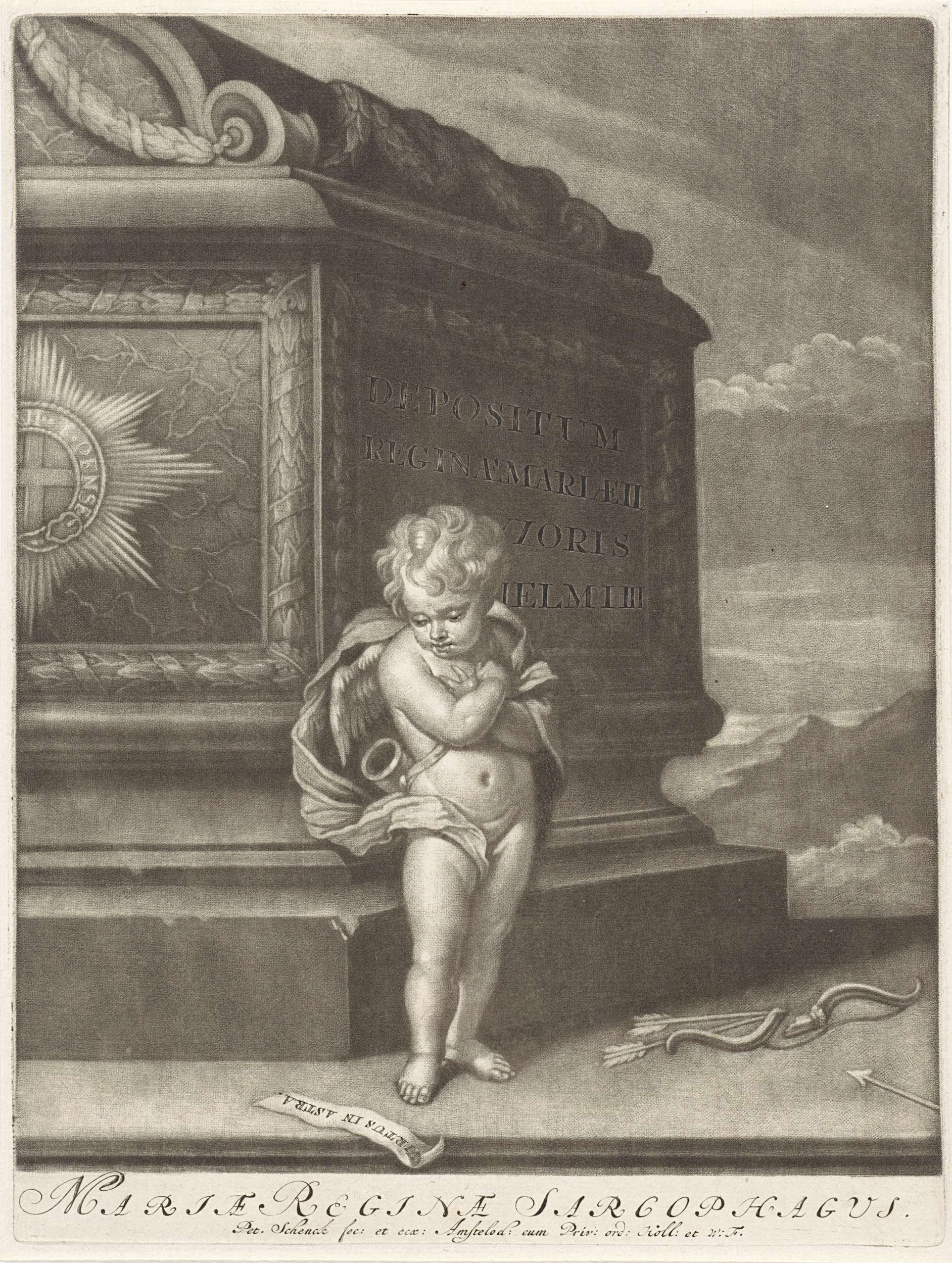 Allegorische voorstelling vervaardigd ter nagedachtenis aan Maria II Stuart, overleden op 7 januari 1695. Een treurende Amor staat bij het graf van de koningin. Zijn pijl en boog liggen gebroken op de grond. Op het strookje papier dat op de grond ligt staat de tekst 'Virtus in Astra'.