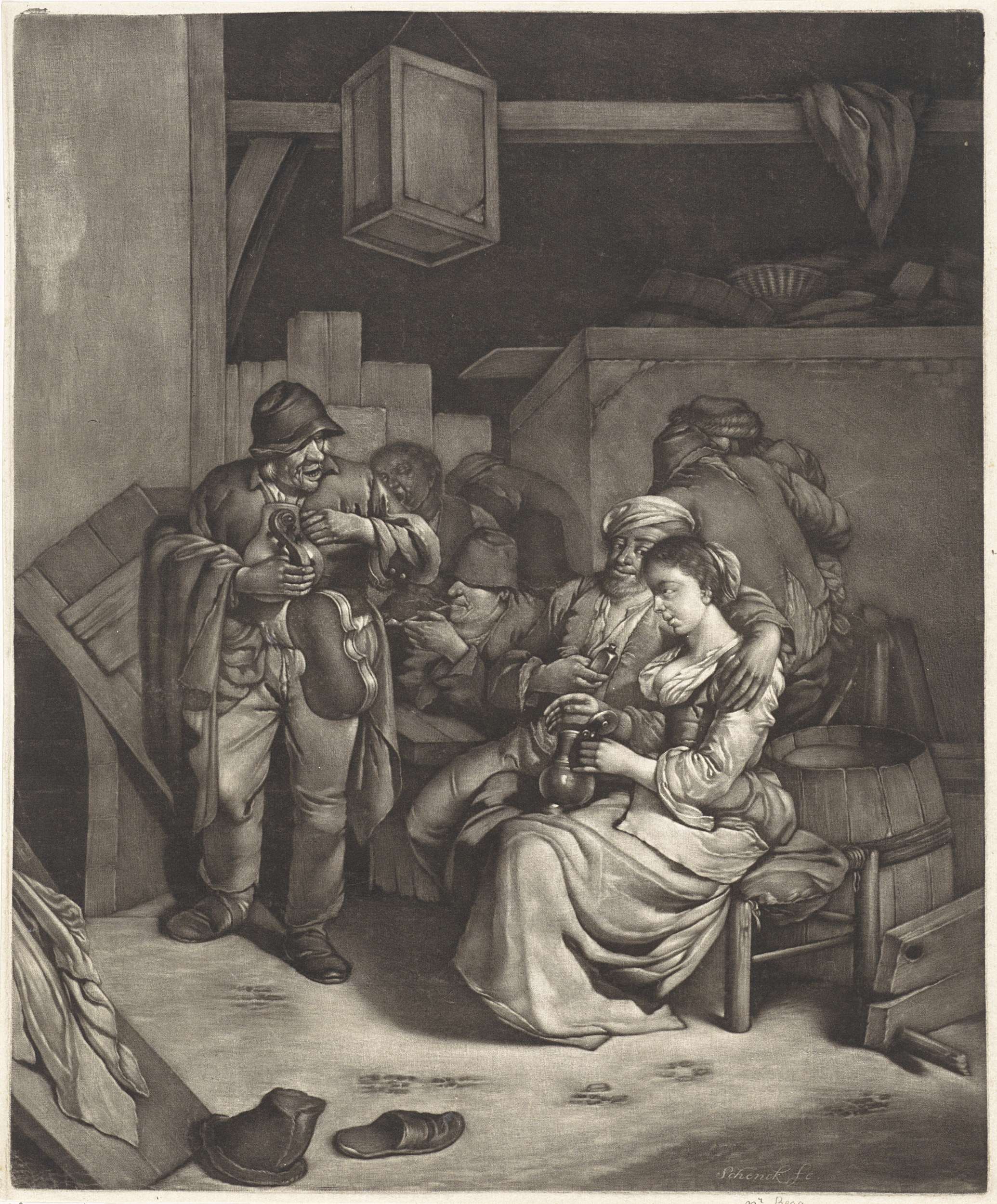 Herberginterieur met rokende en drinkende mannen en een man met een viool. Op de voorgrond een man die zijn arm om een vrouw heen heeft geslagen.