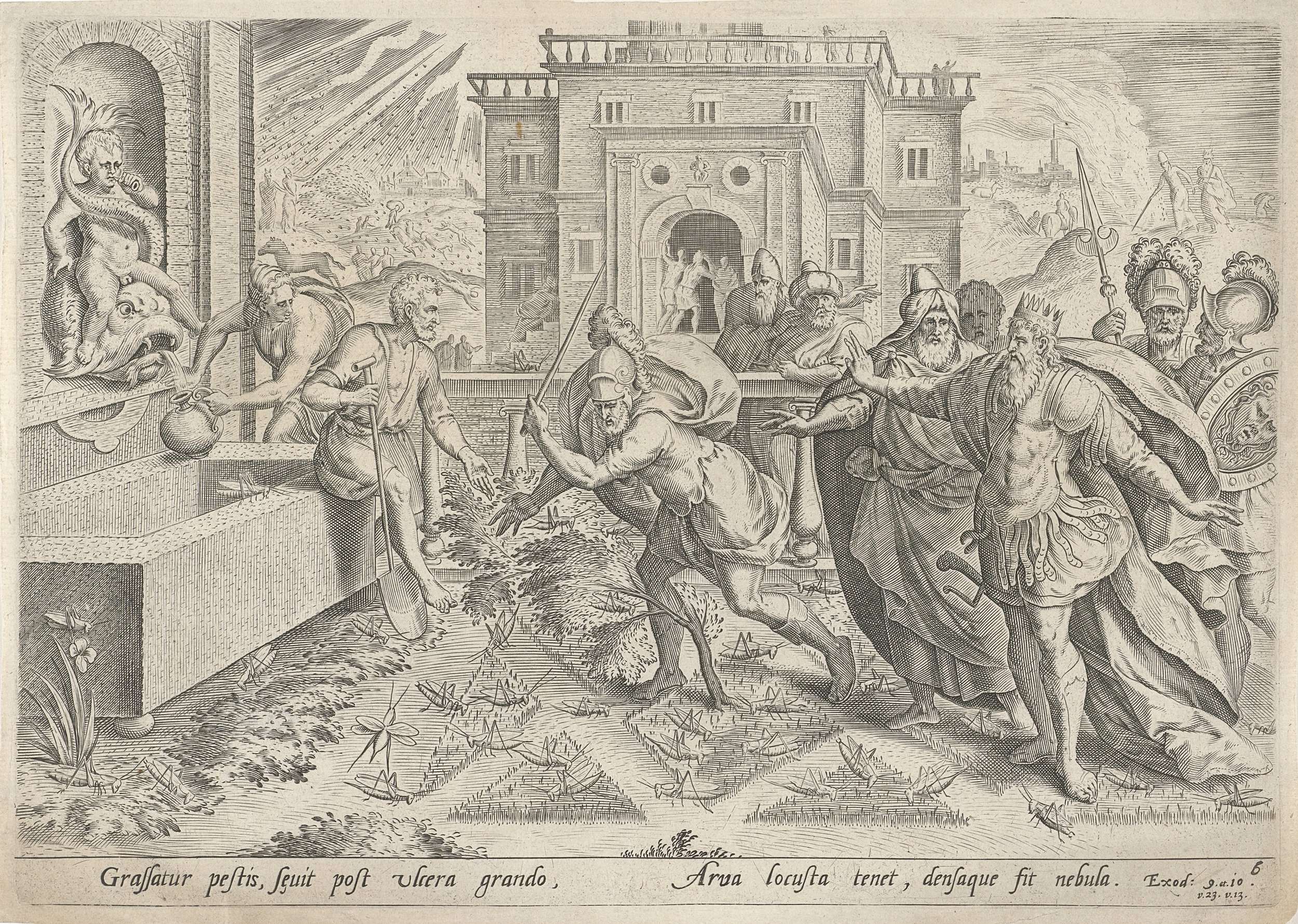 Op de voorgrond de achtste plaag die God over Egypte liet komen: een sprinkhanenplaag. De farao beveelt een van zijn soldaten de sprinkhanen dood te slaan. Links vult een dienaar een kruik met water: een verwijzing naar de eerste plaag van Egypte toen water in bloed veranderde. Op de achtergrond links de zevende plaag van ...