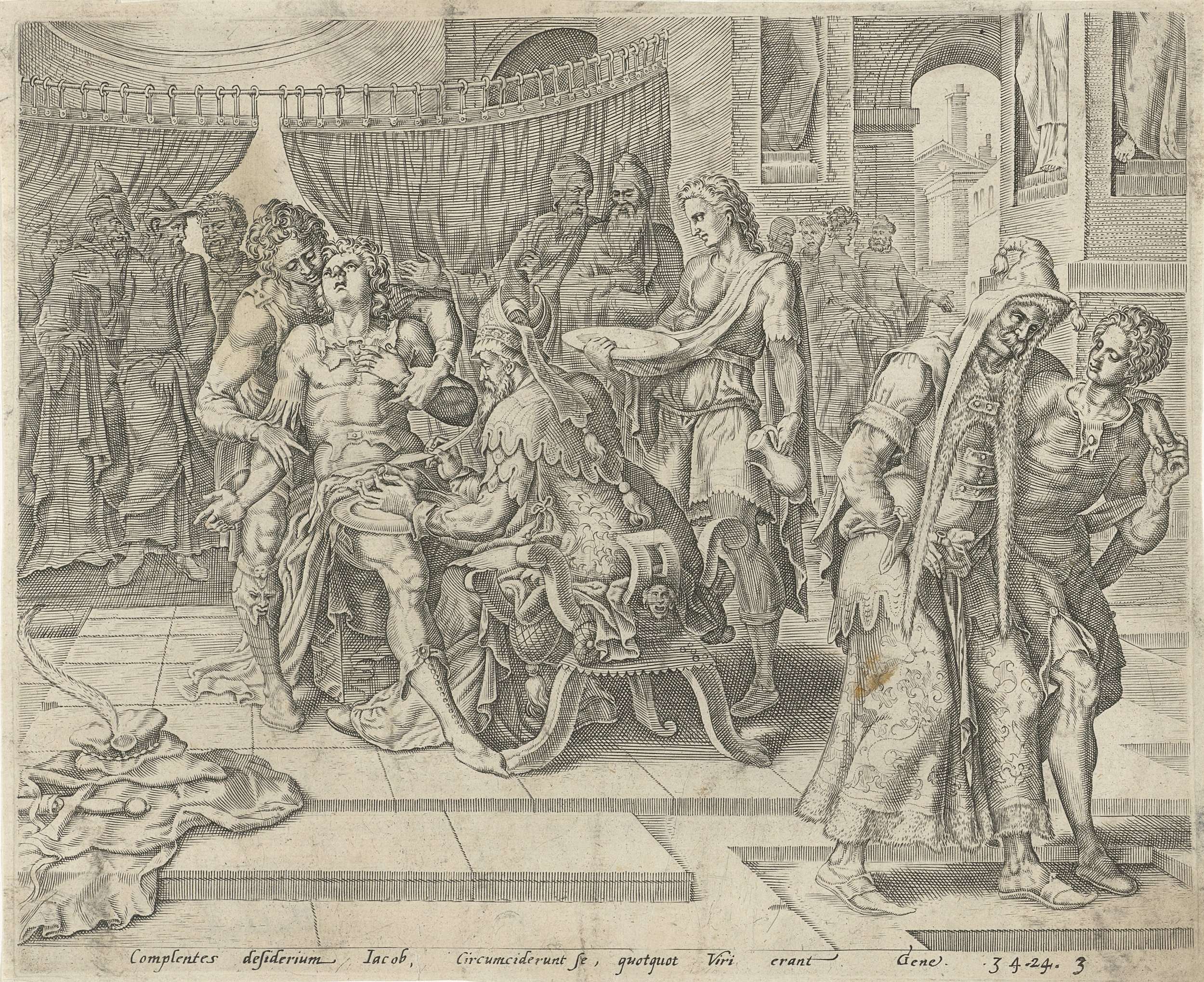 Sichem wordt besneden. Rechts wordt de zojuist besneden Chamor, de vader van Sichem, door een jongen ondersteund. Onderaan in de marge een verwijzing in het Latijn naar de Bijbeltekst in Gen. 34: 24.
