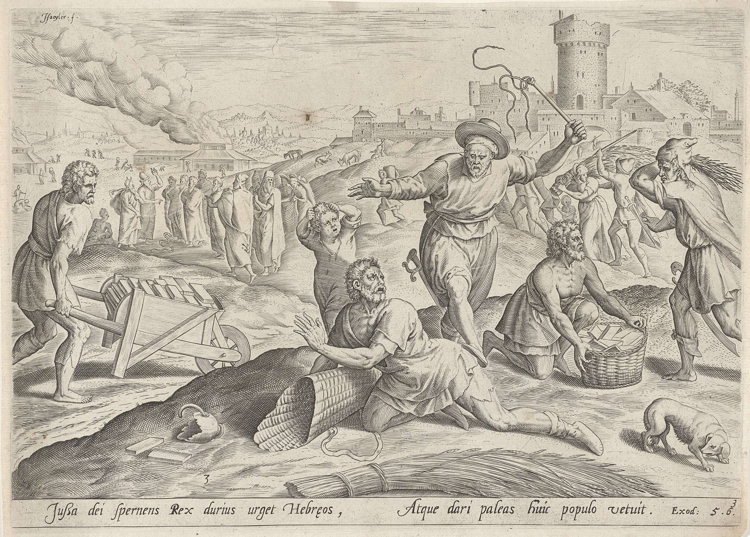Een joodse arbeider valt op de grond en wordt door een van de Egyptische opzichters van de farao met een zweep geslagen. Op de achtergrond preken Mozes en Aäron. De prent heeft een Latijns opschrift.