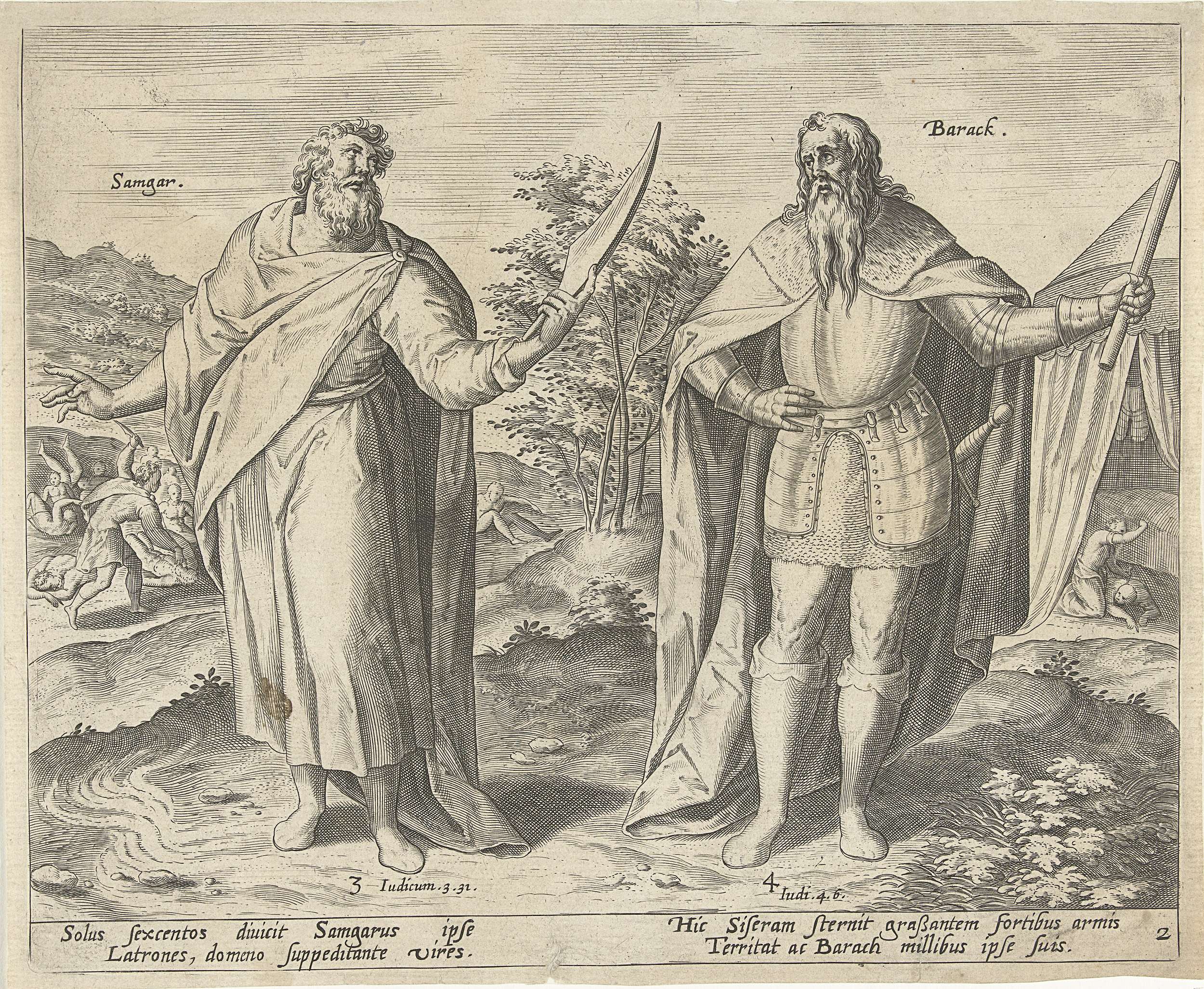Op de voorgrond de derde en vierde Rechter van Israel: Samgar en Barak. Op de achtergrond twee verhalen uit hun tijd. Links verslaat Samgar het Filistijnse leger met een ossenstok. Rechts op de achtergrond wordt de Kanaänitische generaal Sisera door Yael vermoord in haar tent. De prent heeft een Latijns onderschrift.