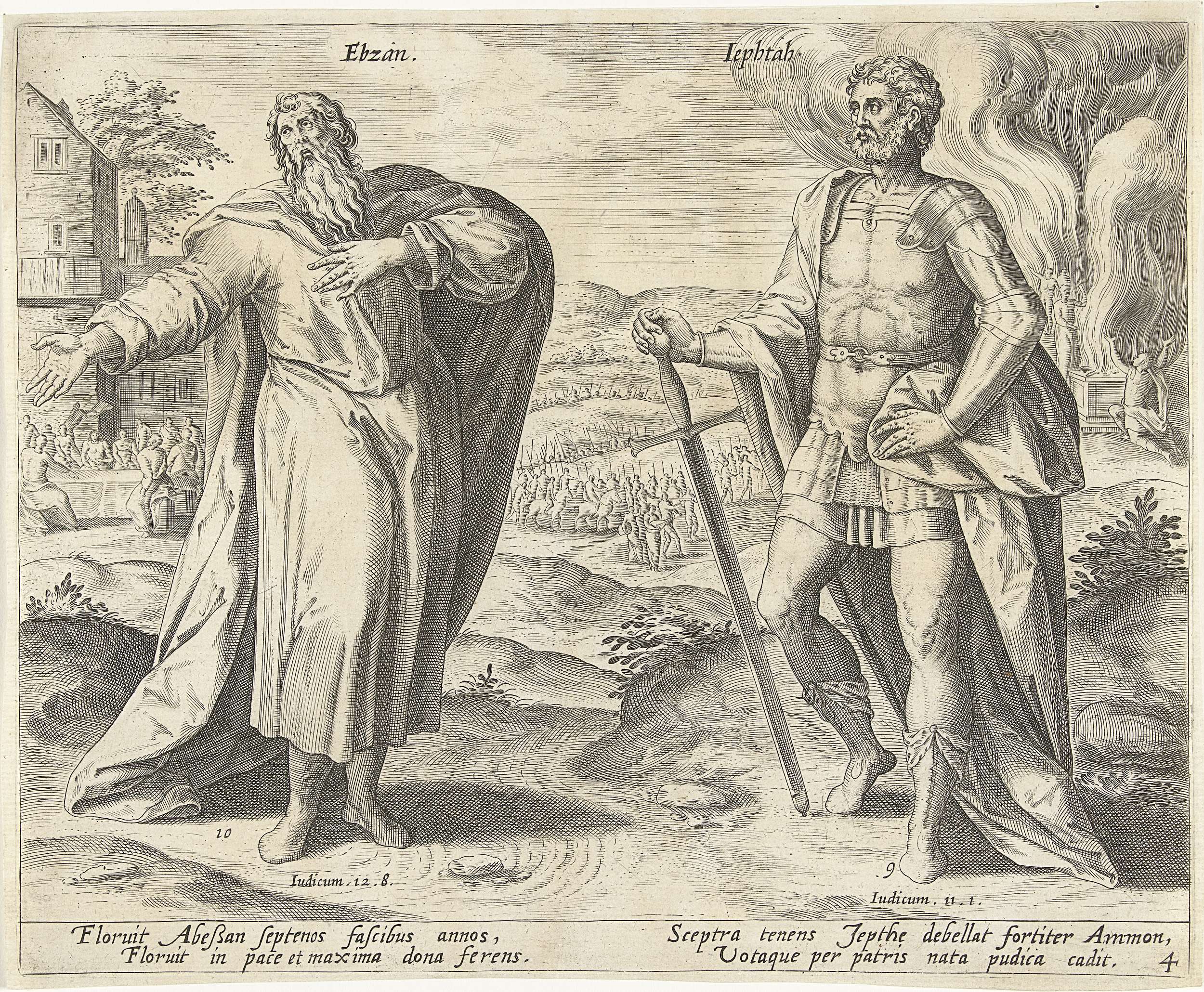 Op de voorgrond de zevende en achtste Rechter van Israel: Ibsan en Jefta. Op de achtergrond twee verhalen uit hun tijd. Rechts offert Jefta zijn eigen dochter aan God. Links de bruiloft van de dertig zonen van Ibsan. De prent heeft een Latijns onderschrift.