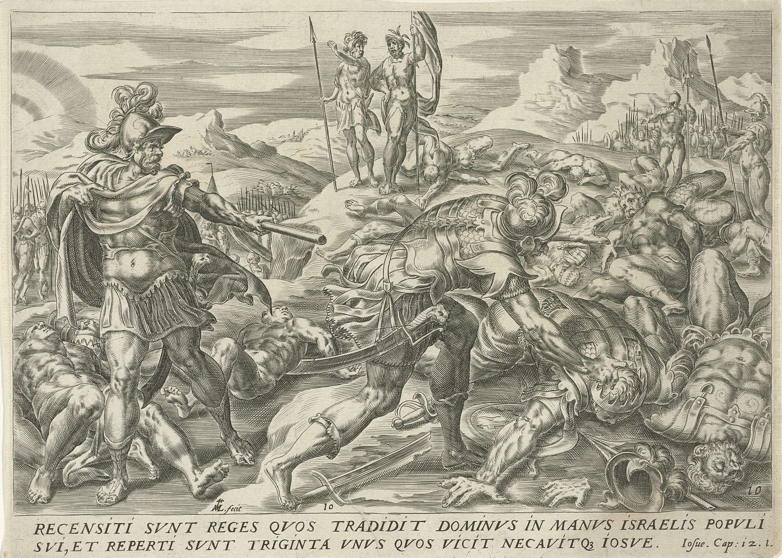 Jozua staat links in een landschap en wijst naar de 31 koningen op de grond, die hij verslagen heeft. Onderaan in de marge een verwijzing naar de Bijbeltekst in het Latijn.