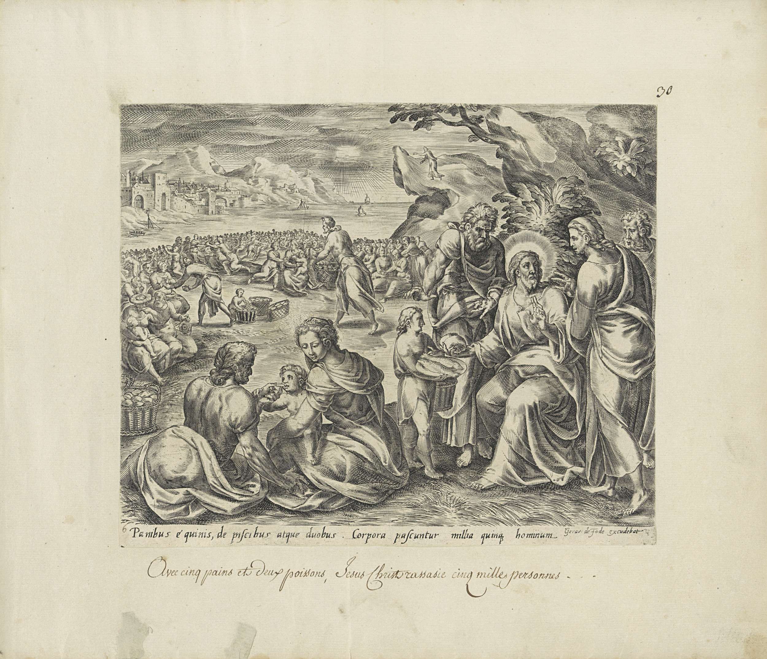 Christus zegent de broden en de vissen, die hem door een kleine jongen worden gebracht. Op de achtergrond delen de apostelen de broden en vissen uit aan de menigte. Verder naar de achtergrond een meer met zeilschepen. Onder de voorstelling een verwijzing in het Latijn naar de Bijbeltekst.