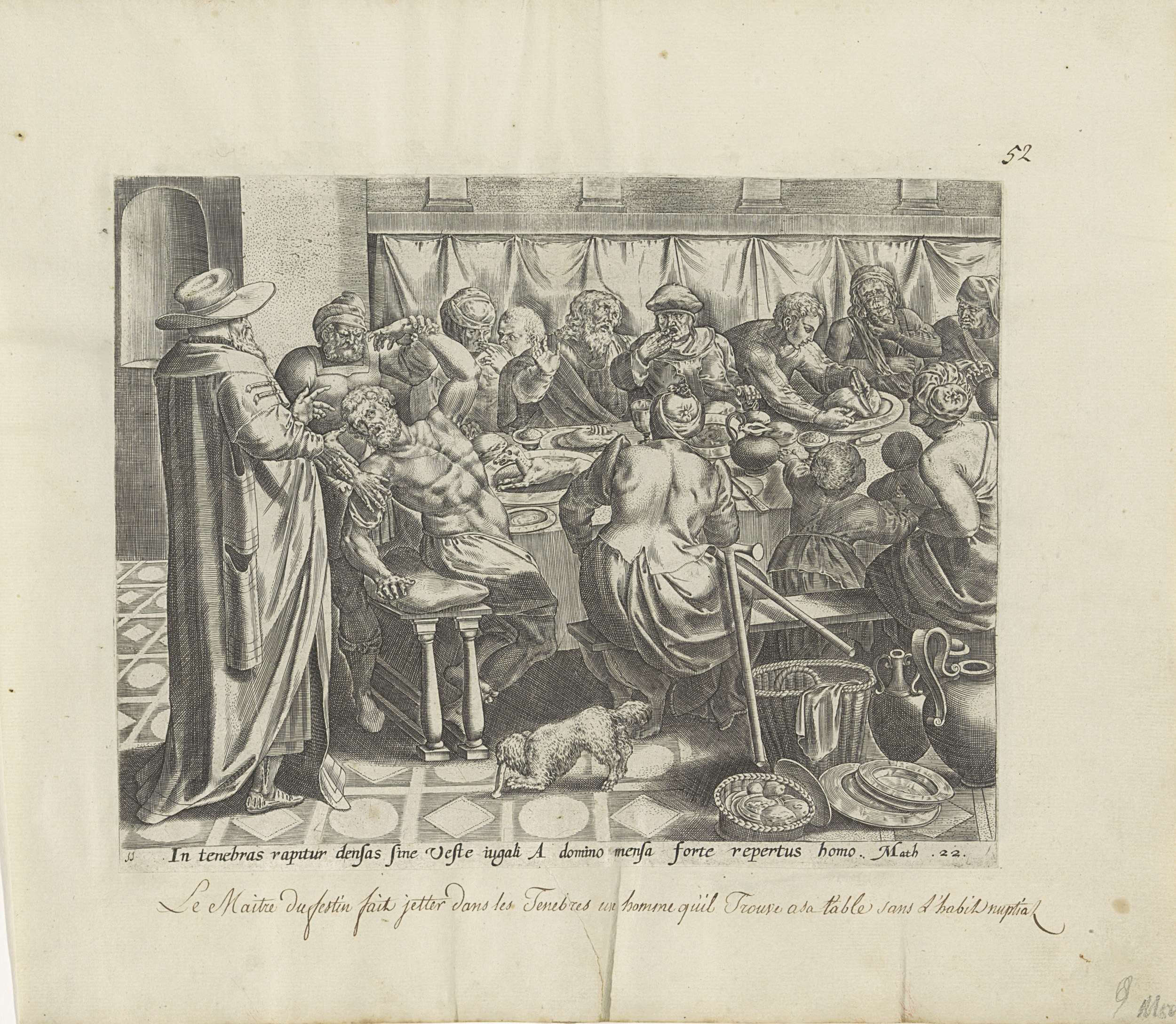 Aan een lange tafel zitten de genodigden van de koning aan het bruiloftsmaal. Het zijn mensen van de straat: de vrouw midden voor heeft krukken naast zich. De koning geeft links de opdracht om de man zonder feestkleding aan handen en voeten te binden en hem in de uiterste duisternis te gooien. Onder de voorstelling ...