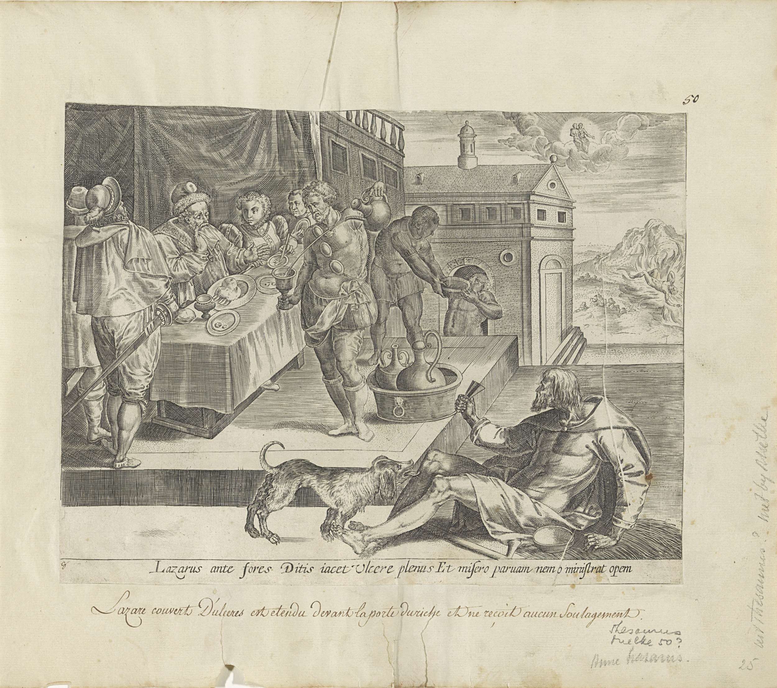 Een rijke man zit met zijn familie en gasten aan tafel. Rechts buiten het huis bedelt de bedelaar Lazarus, wiens zweren door een hond worden gelikt. Op de achtergrond wordt het vervolg van het verhaal verbeeld. Als de rijke man en Lazarus zijn gestorven, zit Lazarus in de hemel bij Abraham op schoot. De rijke ...