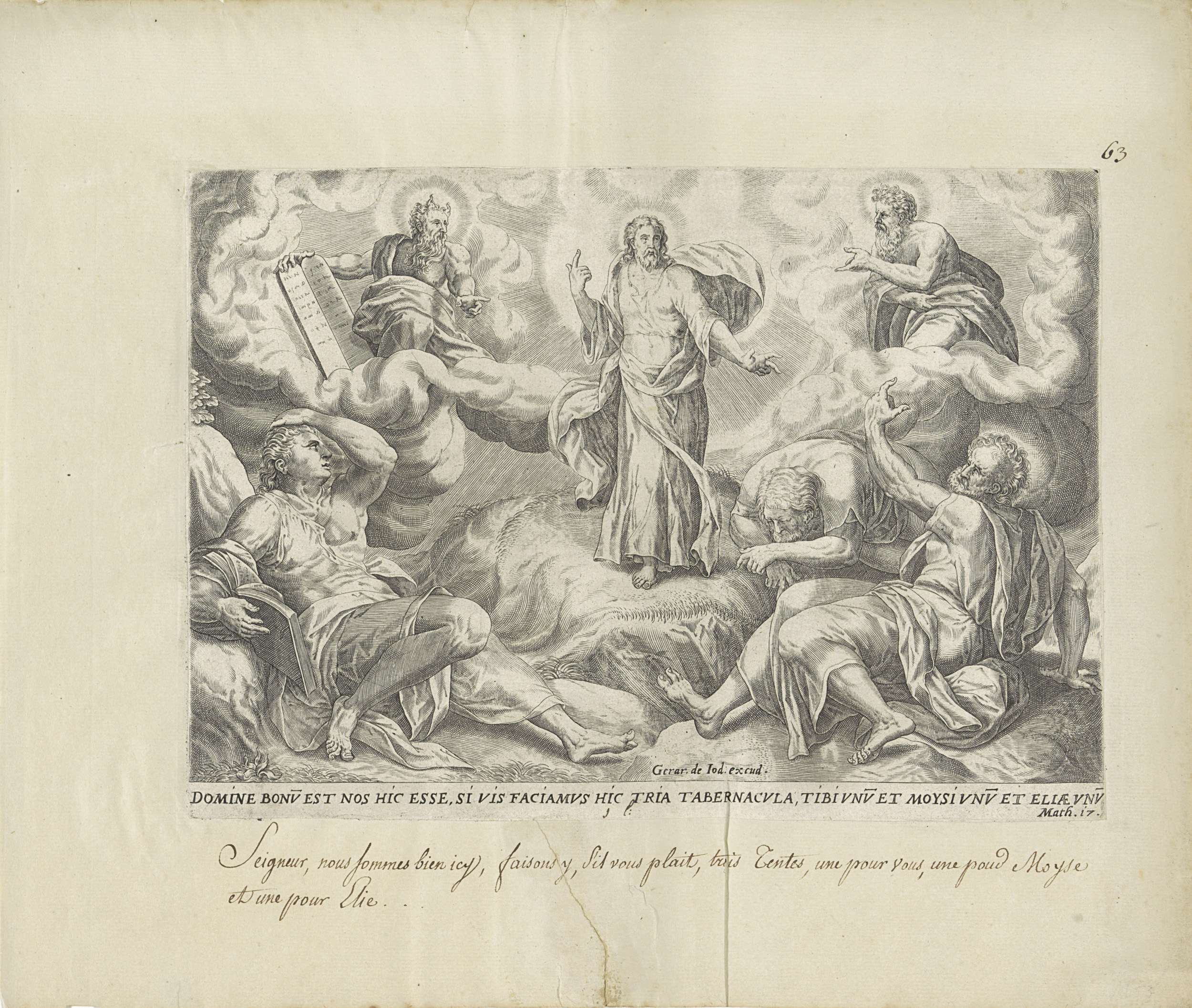 De verheerlijking op de berg. Mozes en Elia verschijnen aan weerszijden van Christus en spreken met hem. Op de berg zitten Jakobus, Johannes en Petrus. De laatste maakt een spreekgebaar en doet het voorstel om voor Christus, Mozes en Elia drie tenten neer te zetten. Onder de voorstelling een verwijzing in het Latijn naar de ...