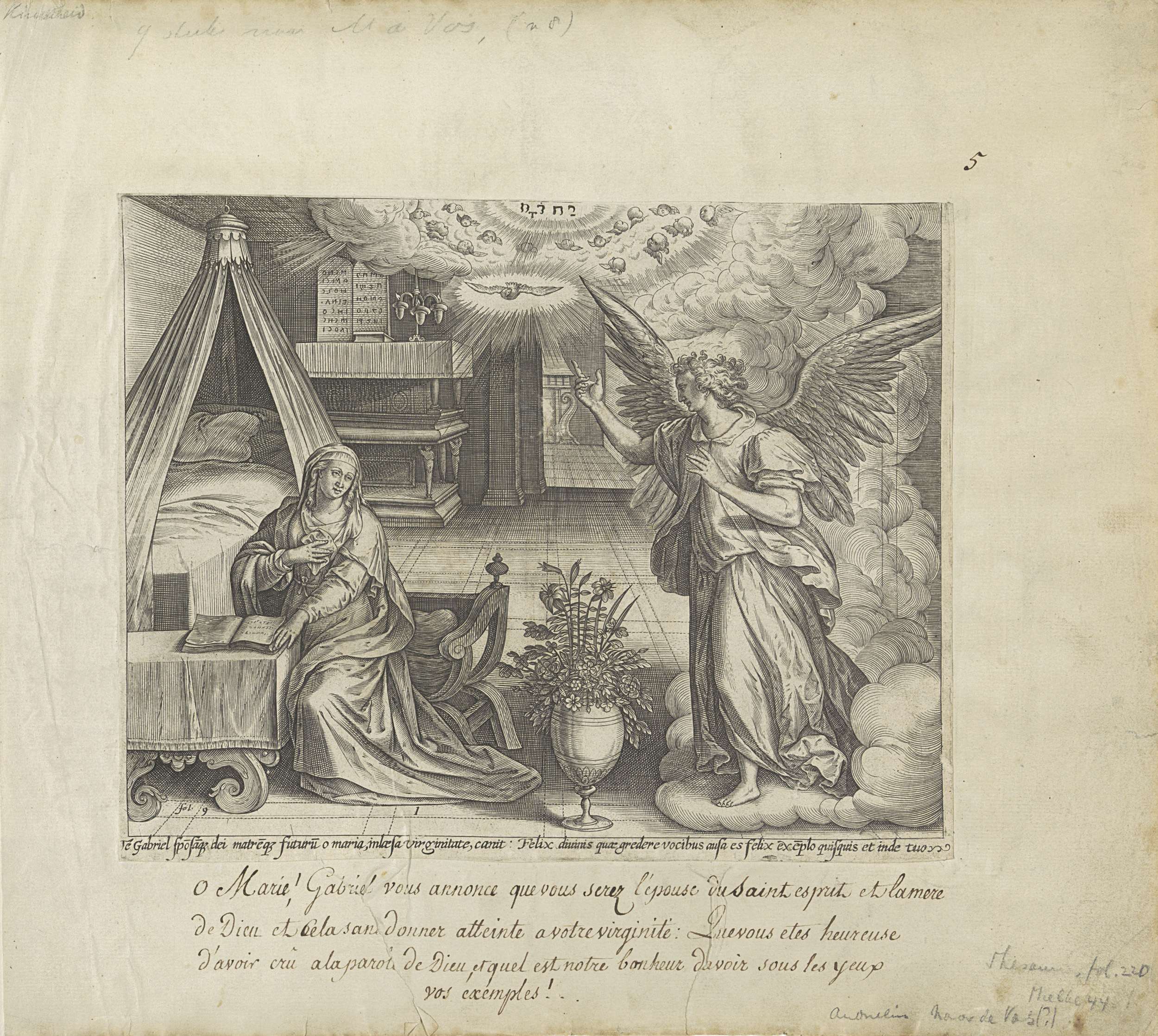 De engel Gabriël kondigt aan Maria aan dat ze zwanger zal worden. Maria zit bij een tafel, waarop een opengeslagen boek ligt. Links een bed. De Heilige Geest daalt als een duif neer. Daarboven het tetragram als symbool van God de Vader en cherubijnen. Onder de voorstelling een verwijzing in het Latijn naar de Bijbeltekst ...