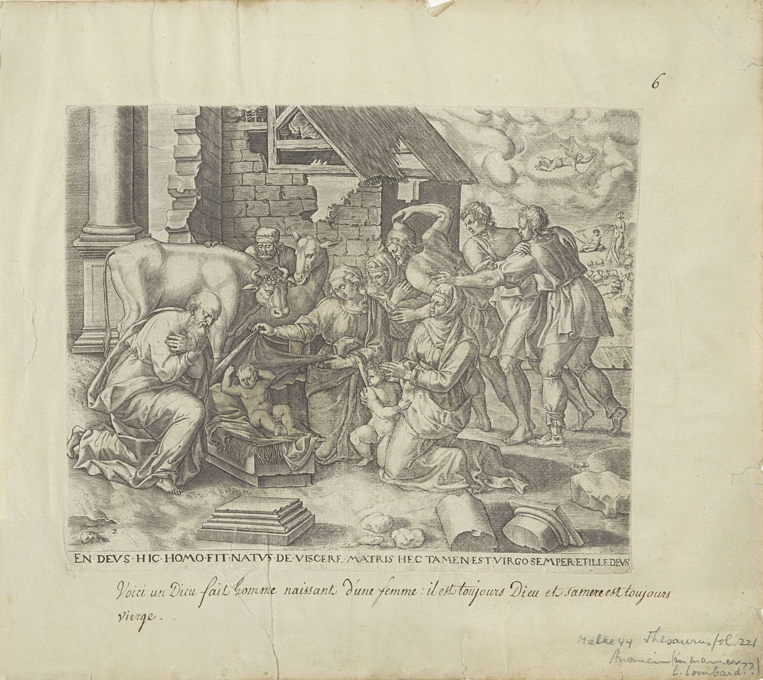 De herders aanbidden het Christuskind, dat in de kribbe ligt. Maria zit naast het Kind en houdt een doek op. Rechts op de achtergrond de aankondiging aan de herders door de engel. Jozef staat achter de os en de ezel. Onder de voorstelling een toelichting in het Latijn.