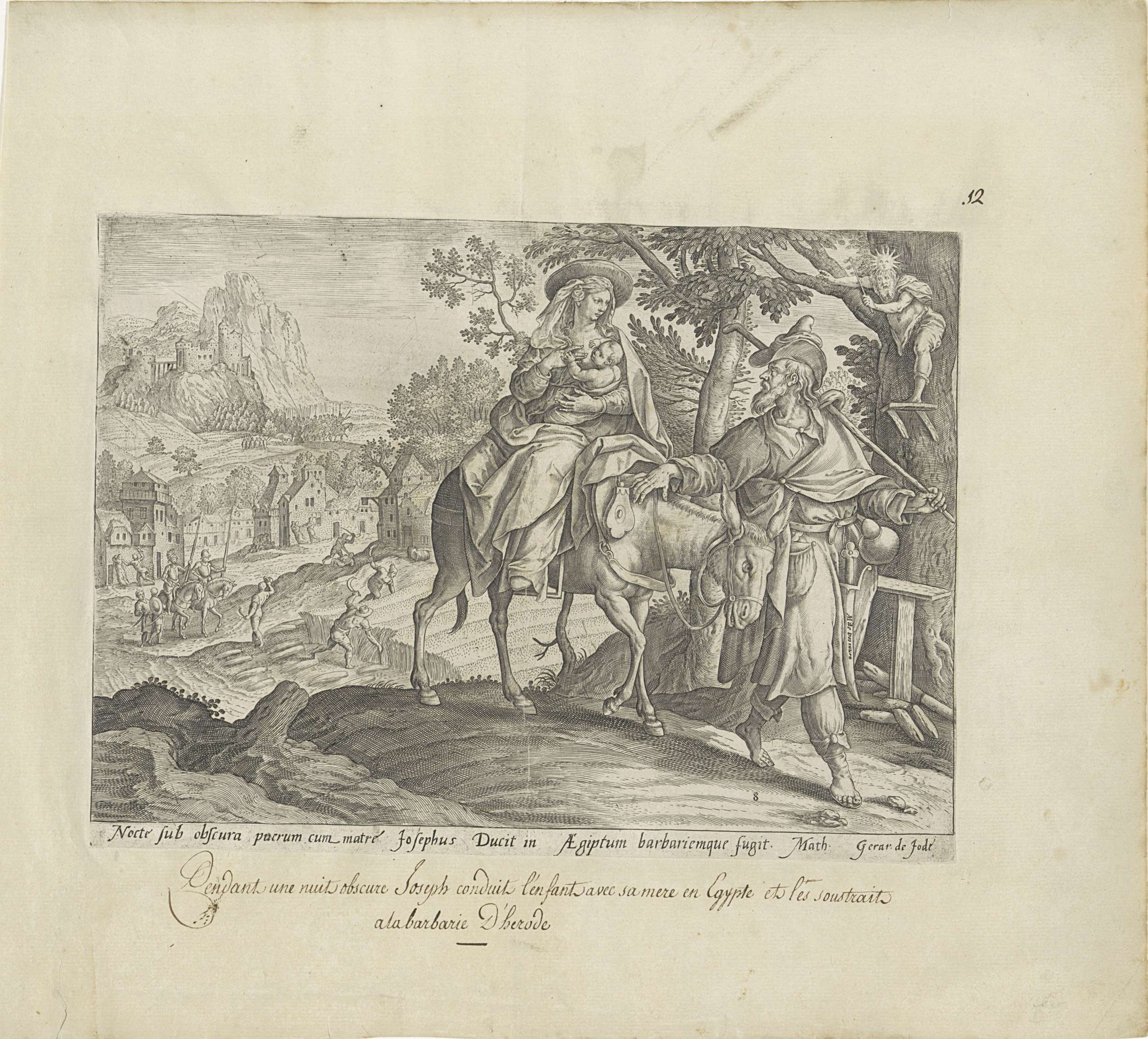 Maria geeft Christus de borst, terwijl zij op de ezel zit tijdens de vlucht naar Egypte. Jozef leidt de ezel. Op de achtergrond de kindermoord te Betlehem en de legende van het snel groeiende koren. Enkele soldaten te paard vragen aan een boer of hij een familie voorbij heeft zien gaan. De boer vertelt dat ...
