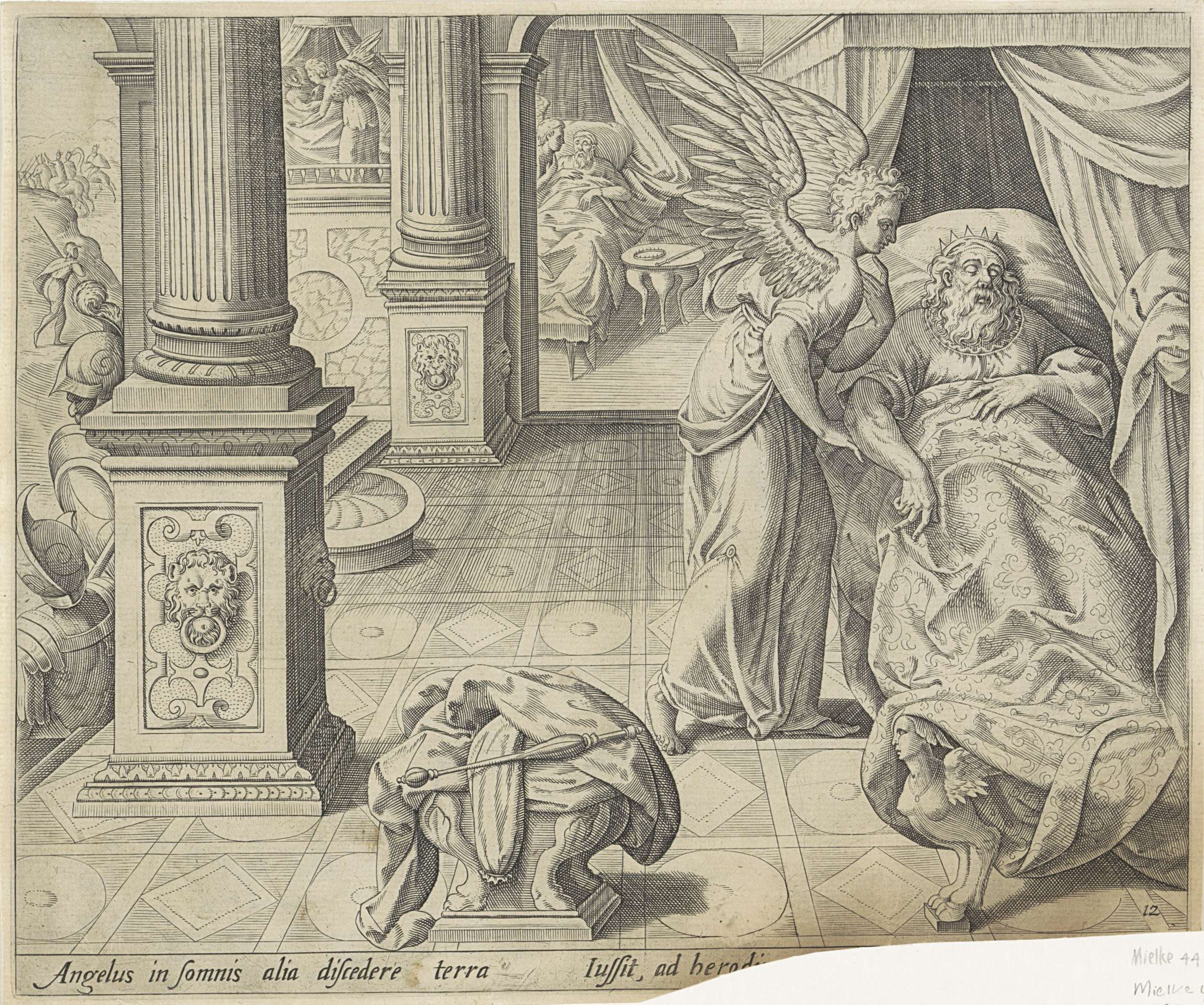 De drie koningen worden in een droom gewaarschuwd om niet naar Herodes terug te keren. Naast het bed van iedere koning staat een engel die dit hen influistert. Onder de voorstelling een toelichting in het Latijn.