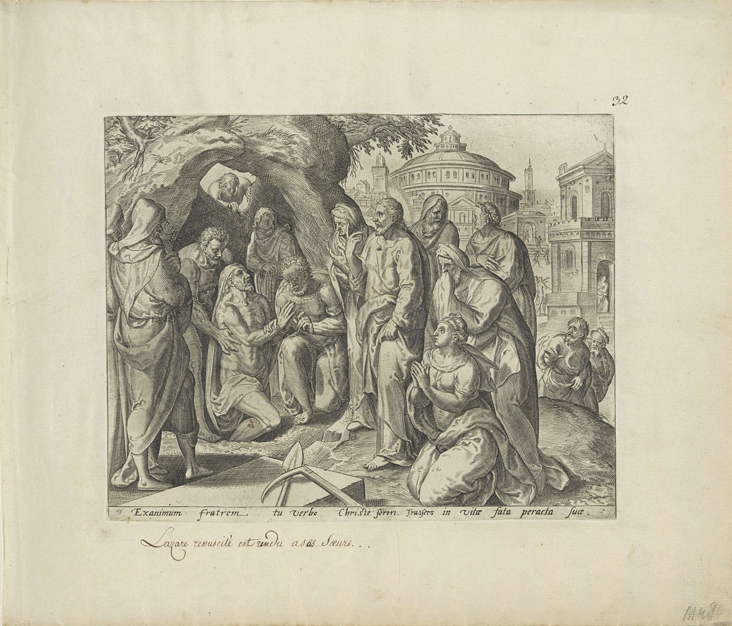 Christus wenkt met zijn vinger en wekt Lazarus op uit de dood. Vrienden van Lazarus helpen hem uit het graf. Onder de voorstelling een verwijzing in het Latijn naar de Bijbeltekst.